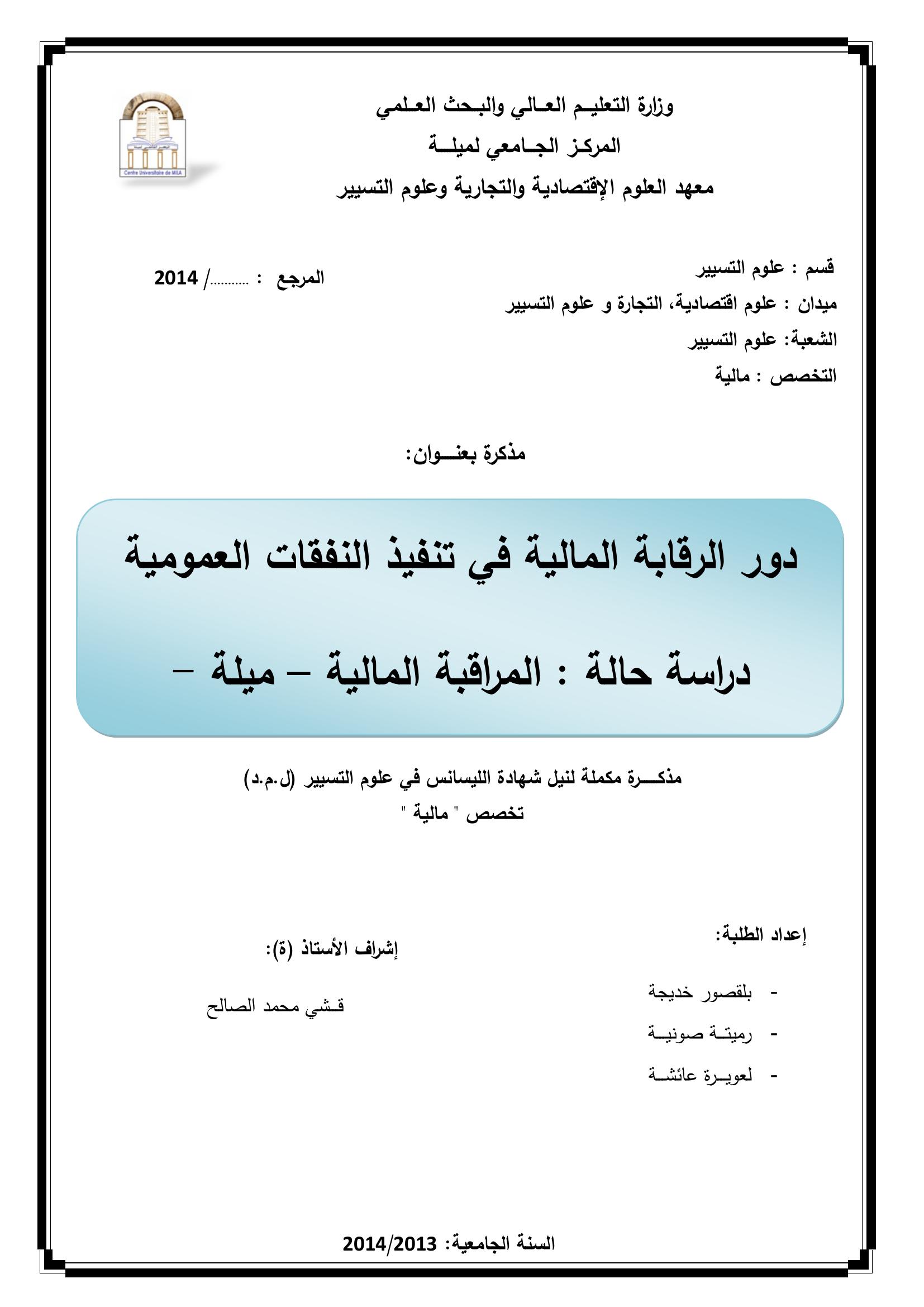 بلقصور خديجة & قشي محمد الصالح(مشرفا) (2014). دور الرقابة المالية في تنفيذ النفقات العمومية دراسة حالة المراقبة المالية -ميلة-.