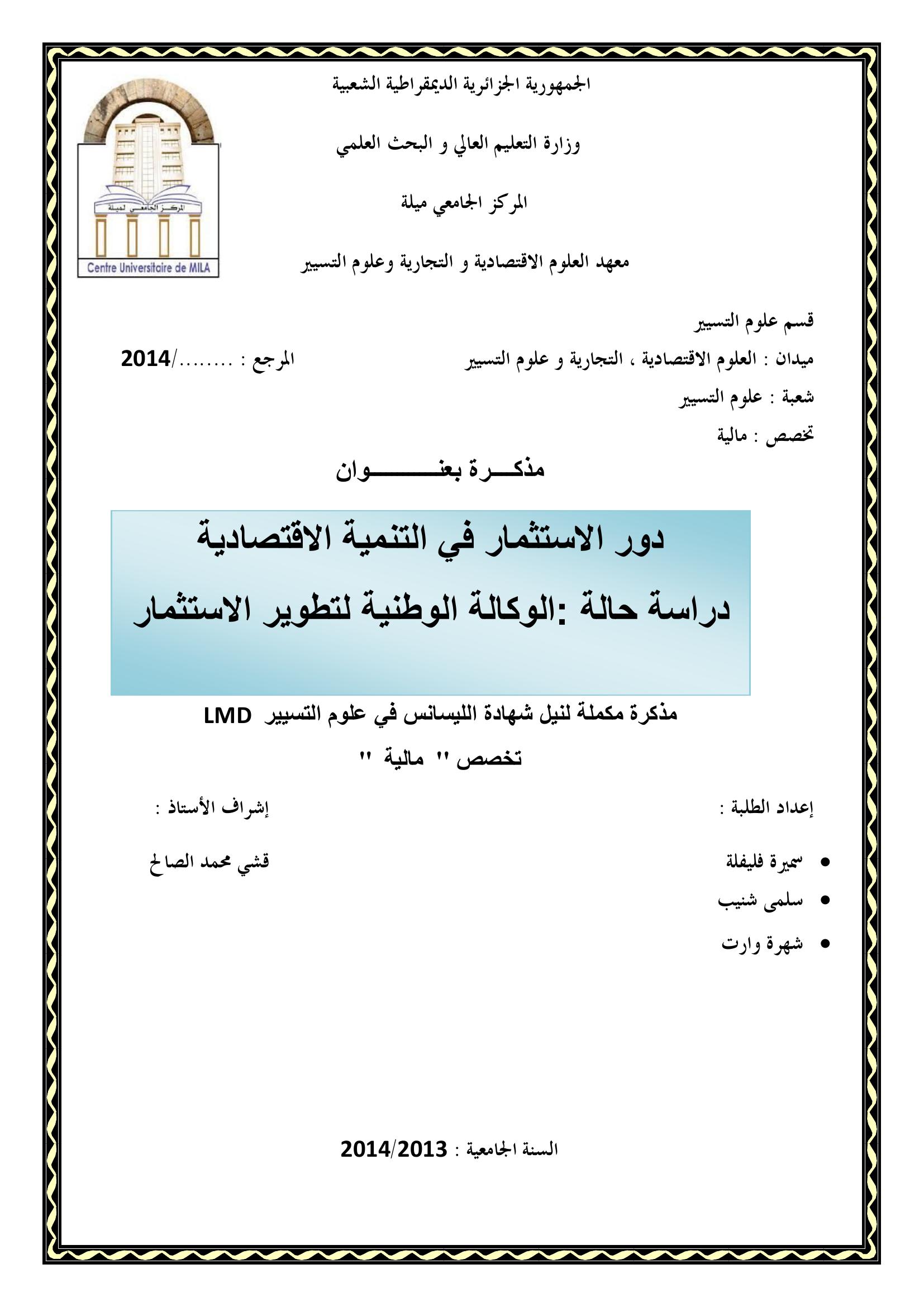 فليفلة سميرة & قشي محمد الصالح(مشرفا) (2014). دور الاستثمار في التنمية الاقتصادية دراسة حالة الوكالة الوطنية لتطوير الاستثمار.