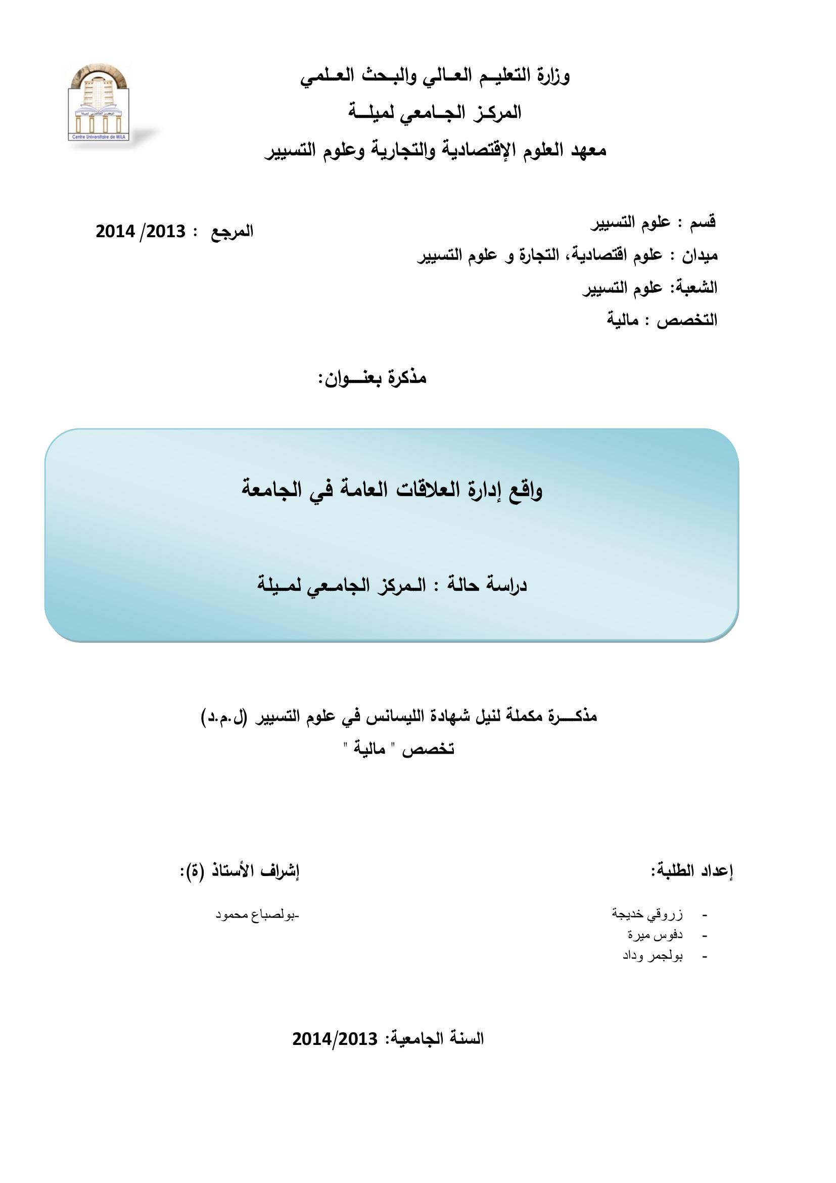 زروقي خديجة & بولصباع محمود (مشرفا) (2014). واقع إدارة العلاقات العامة في الجامعة دراسة حالة المركز الجامعي لميلة.