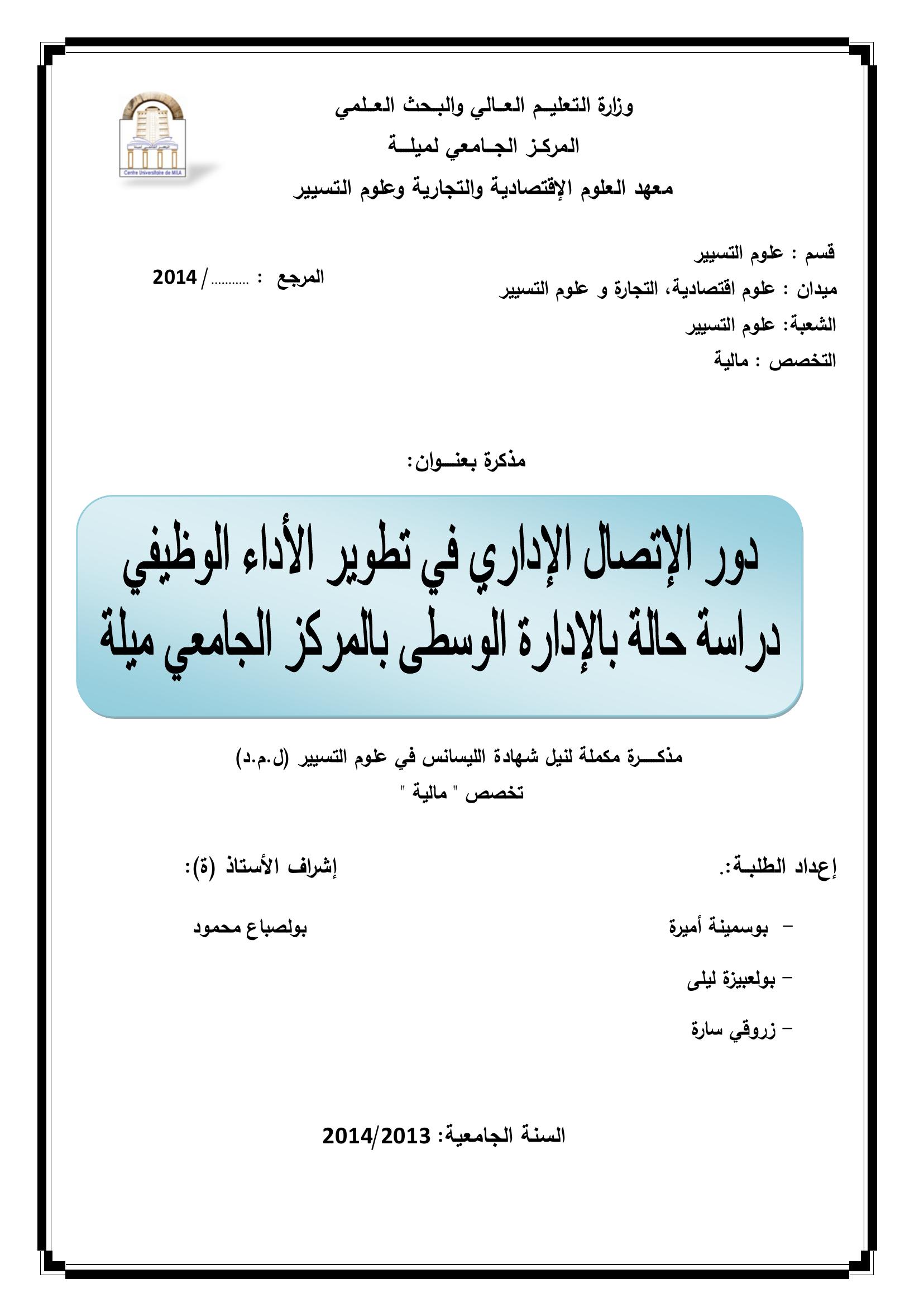 بوسمينة أميرة & بولصباع محمود (مشرفا) (2014). دور الاتصال الاداري في تطوير الأداء الوظيفي دراسة حالة بالإدارة الوسطى بالمركز الجامعي (ليسانس- ل م د) . ميلة.