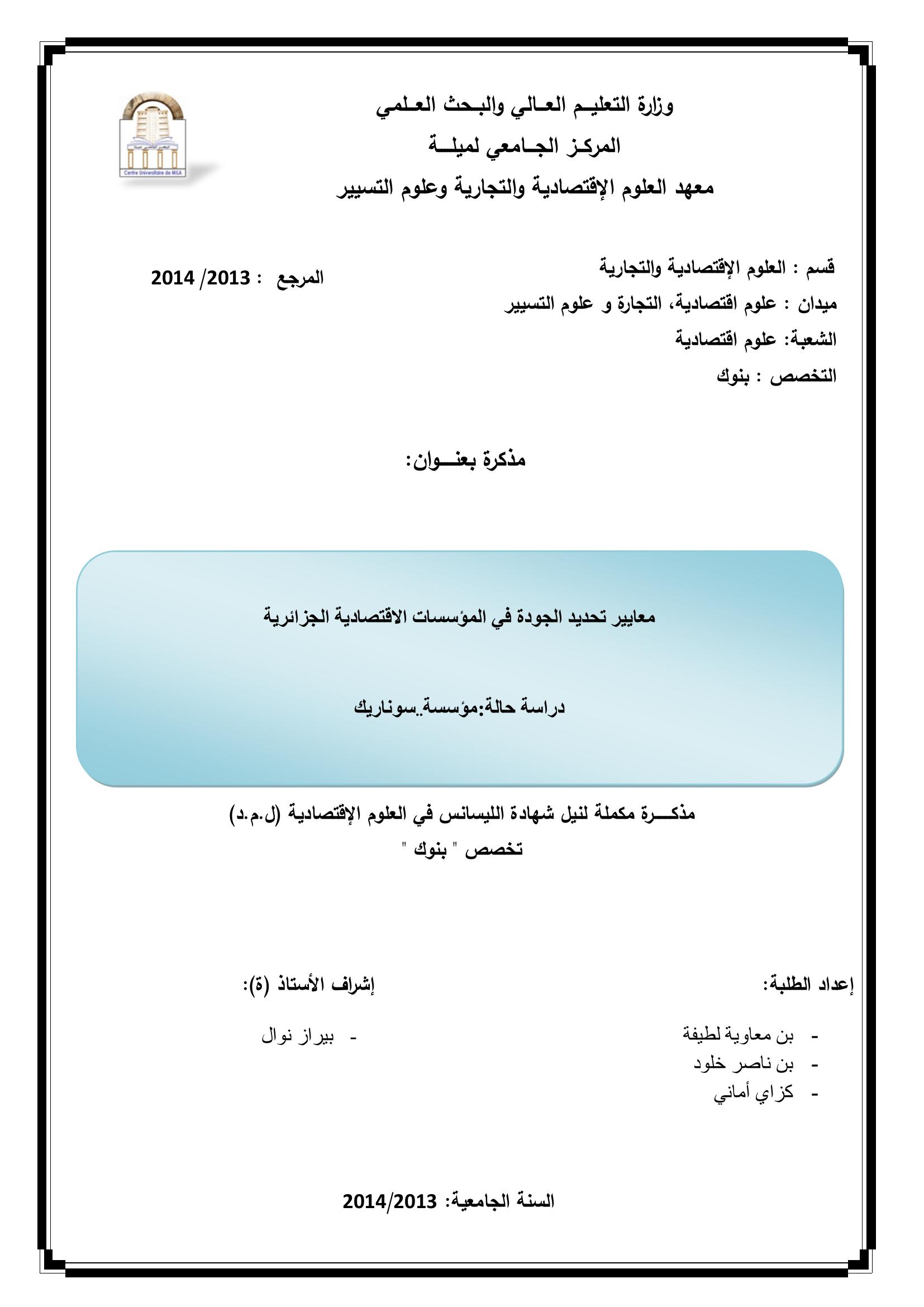 معايير تحديد الجودة في المؤسسات الاقتصادية الجزائرية دراسة حالة مؤسسة سوناريك