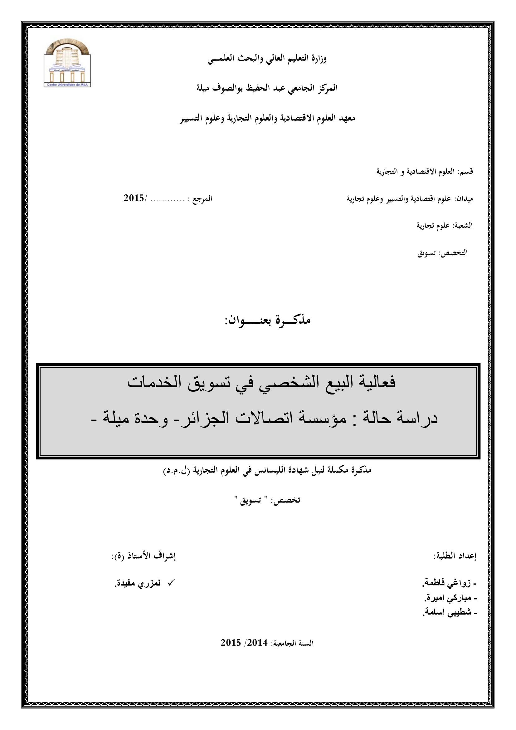 زواغي فاطمة & لمزري مفيدة(مشرفا) (2015). فعالية البيع الشخصي في تسويق الخدمات دراسة حالة مؤسسة اتصالات الجزائر -وحدة ميلة-.
