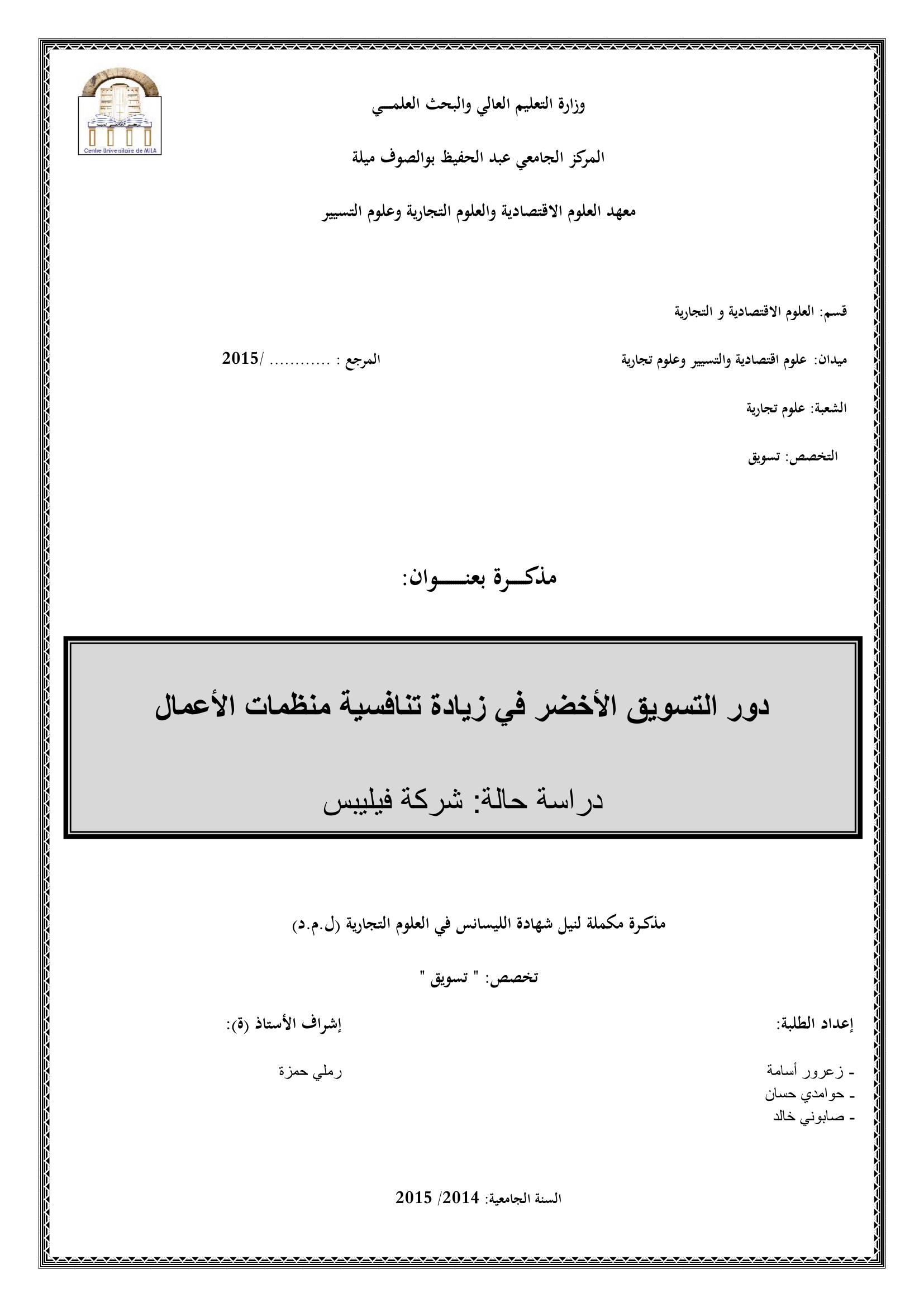 زعرور أسامة & رملي حمزة(مشرفا) (2015). دور التسويق الاخضر في زيادة تنافسية منظمات الأعمال دراسة حالة شركة فيليبس.