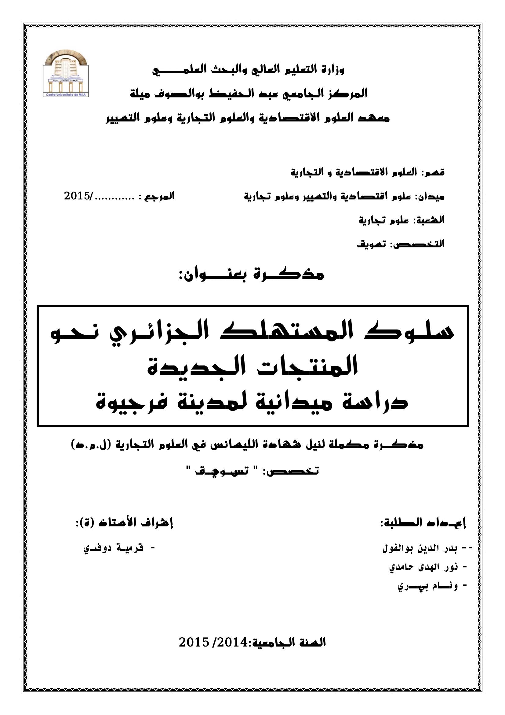 بوالفول بدر الدين & دوفي قرمية(مشرفا) (2015). سلوك المستهلك الجزائري نحو المنتجات الجديدة دراسة ميدانية لمدينة فرجيوة.