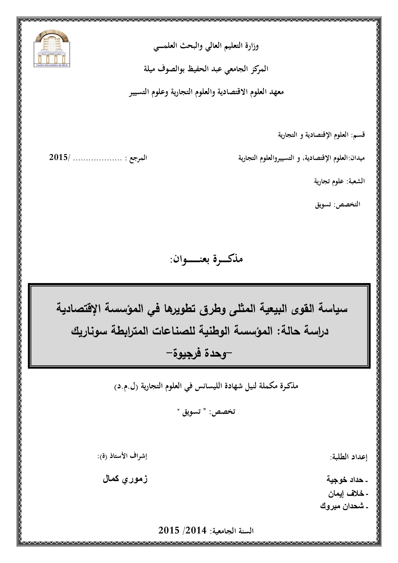 حداد خوجية & زموري كمال (مشرفا) (2015). سياسة القوى البيعية المثلى وطرق تطويرها في المؤسسة الإقتصادية : دراسة حالة المؤسسة الوطنية للصناعات المترابطة سوناريك- وحدة فرجيوة-.