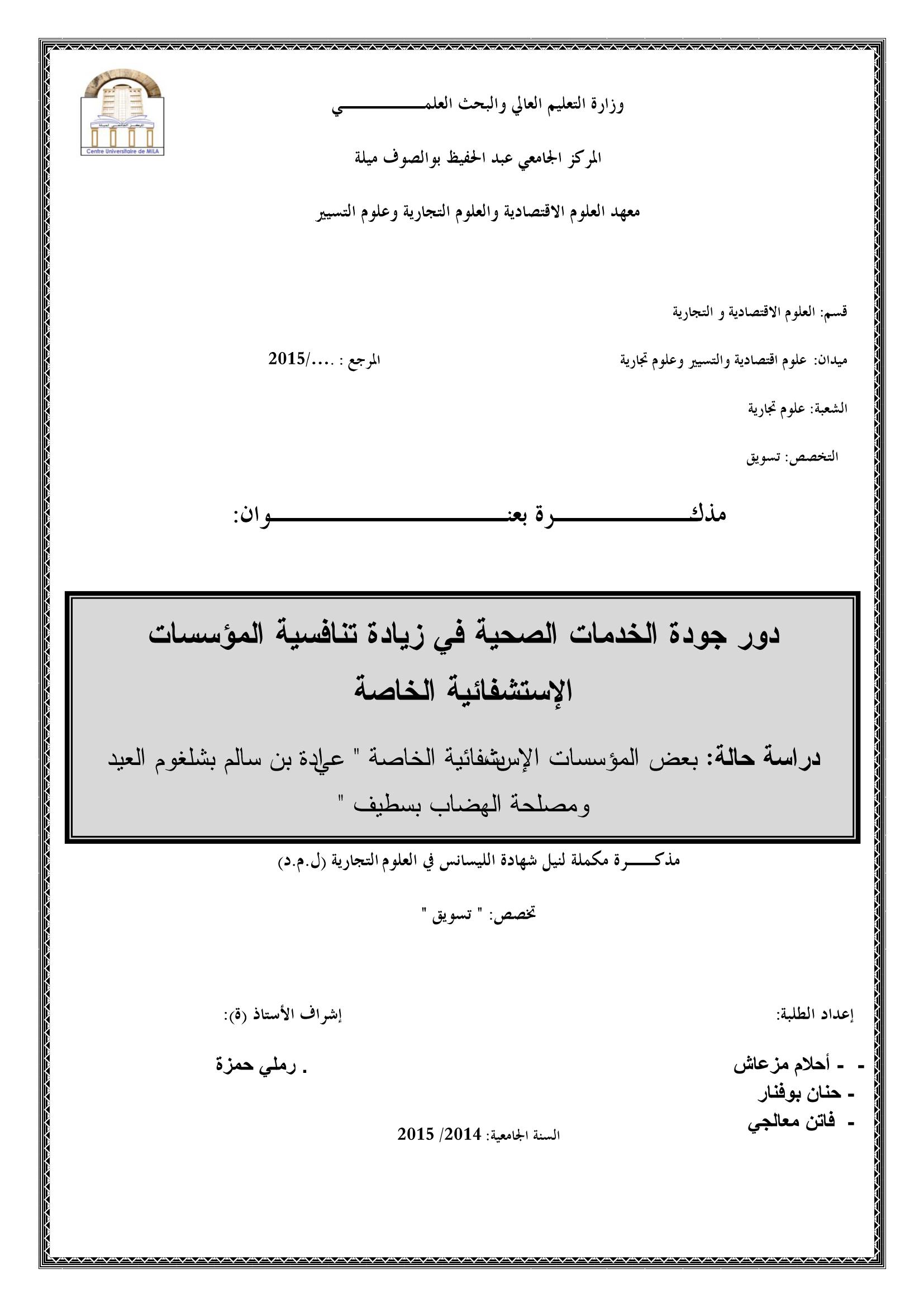 مزعاش أحلام & رملي حمزة(مشرفا) (2015). دور جودة الخدمات الصحية في زيادة تنافسية المؤسسات الإستشفائية الخاصة.