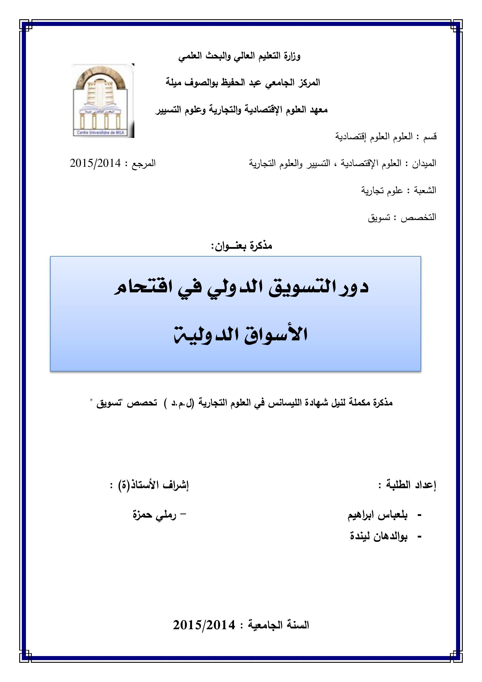 بلعباس إبراهيم & رملي حمزة(مشرفا) (2015). دور التسويق الدولي في إقتحام الأسواق الدولية.