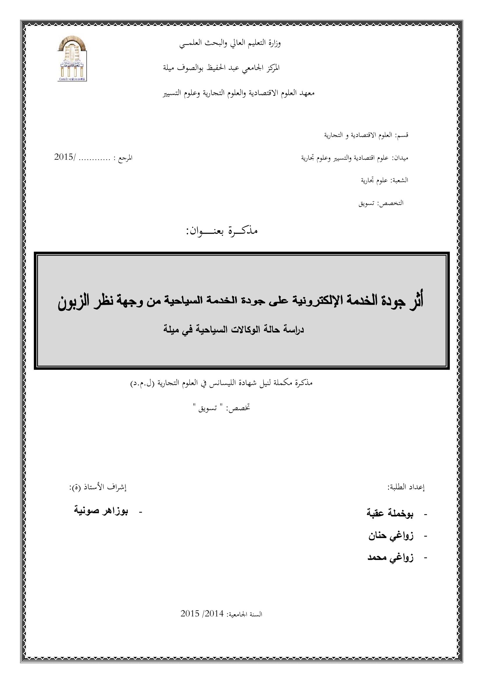 بوخملة عقبة & باديس نبيلة (مشرفا) (2015). أثر جودة الخدمة الإلكترونية على جودة الخدمة السياحية من وجهة نظر الزبون : دراسة حالة الوكالات السياحية في ميلة.