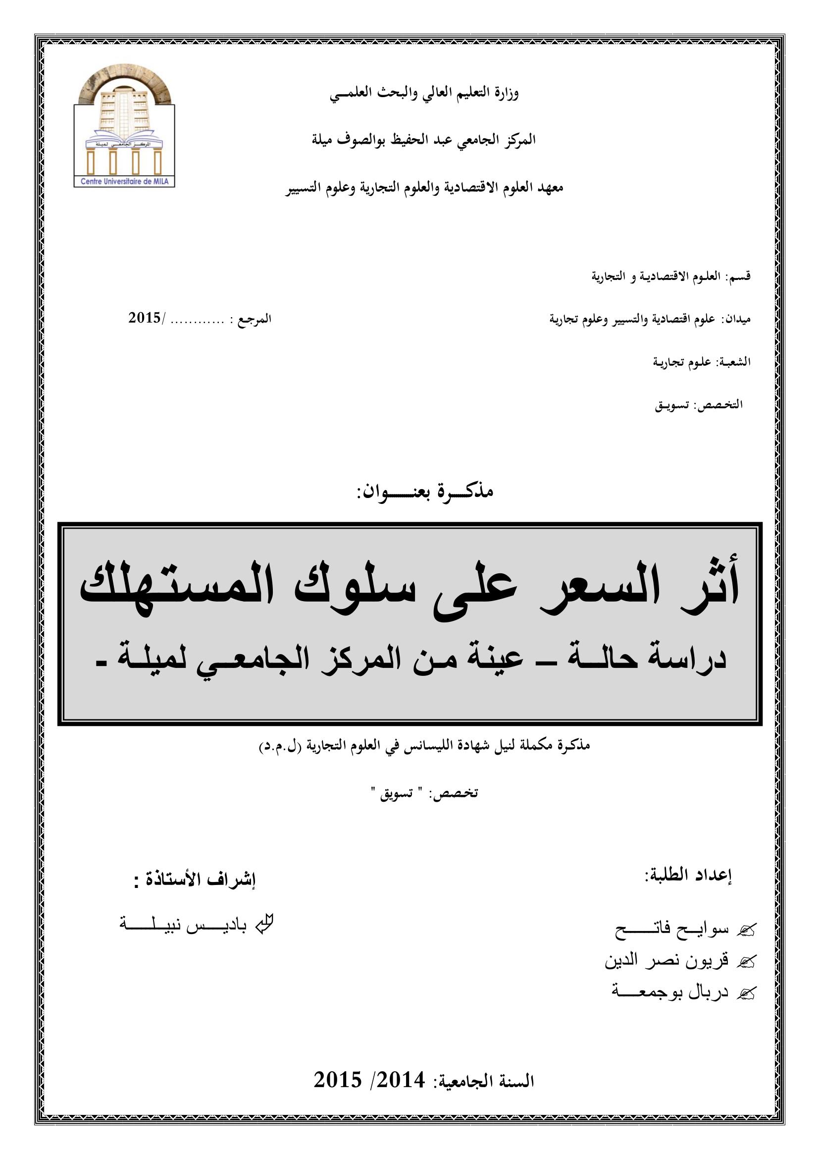 سوايح فاتح & باديس نبيلة (مشرفا) (2015). أثر السعر على سلوك المستهلك دراسة حالة عينة من المركز الجامعي لميلة-.