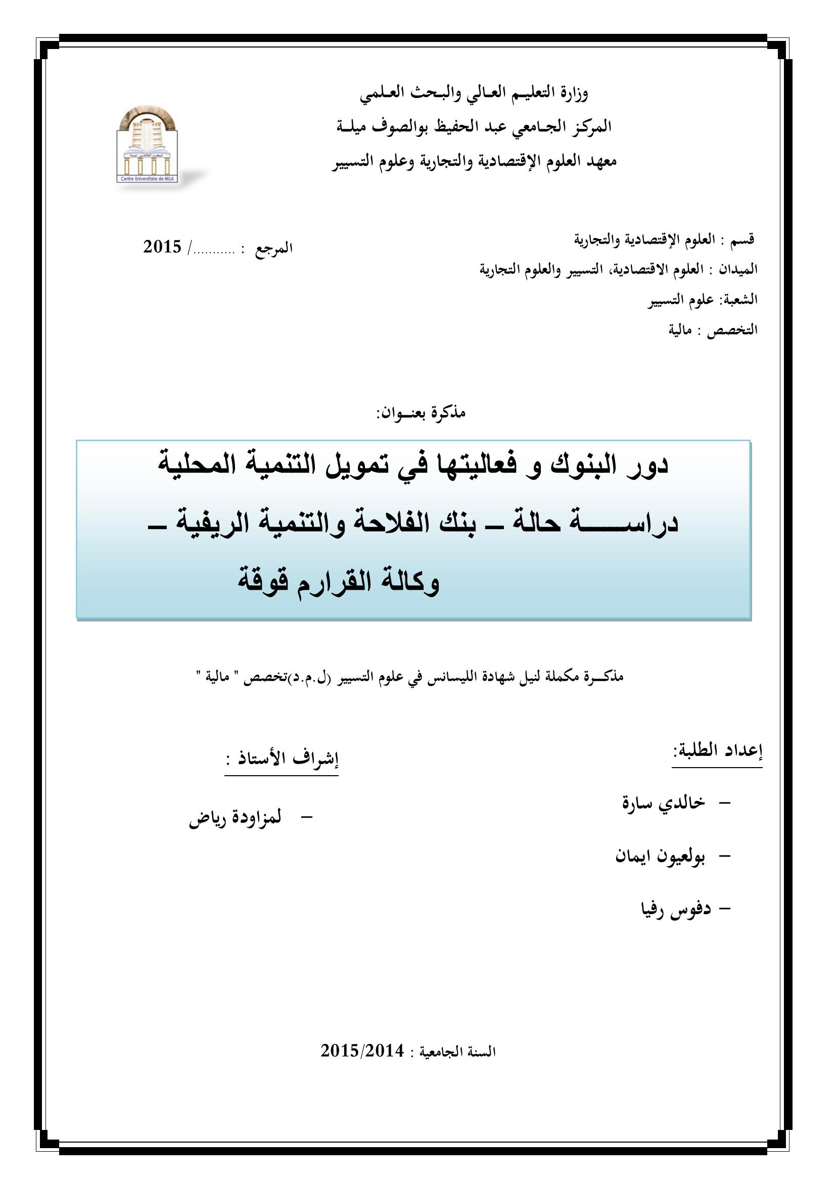 خالدي سارة & لمزاودة رياض (مشرفا) (2015.). دور البنوك وفعاليتها في تمويل التنمية المحلية :دراسة حالة بنك الفلاحة والتنمية الريفية وكالة القرارم (ليسانس- ل م د) .