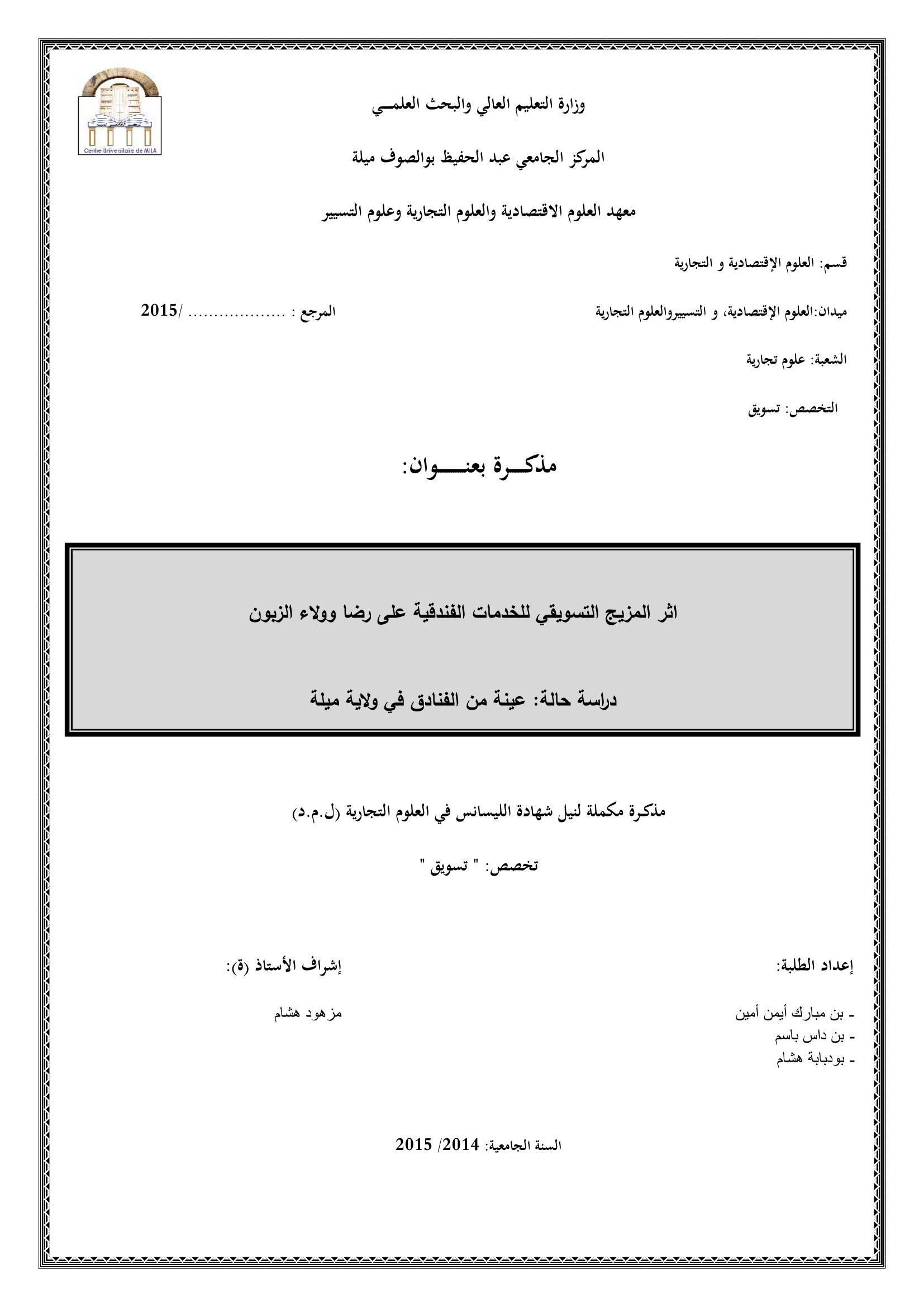 بن مبارك أيمن أمين & مزهود هشام(مشرفا) (2015). أثر المزيج التسويقي للخدمات الفندقية على رضاوولاء الزبون.