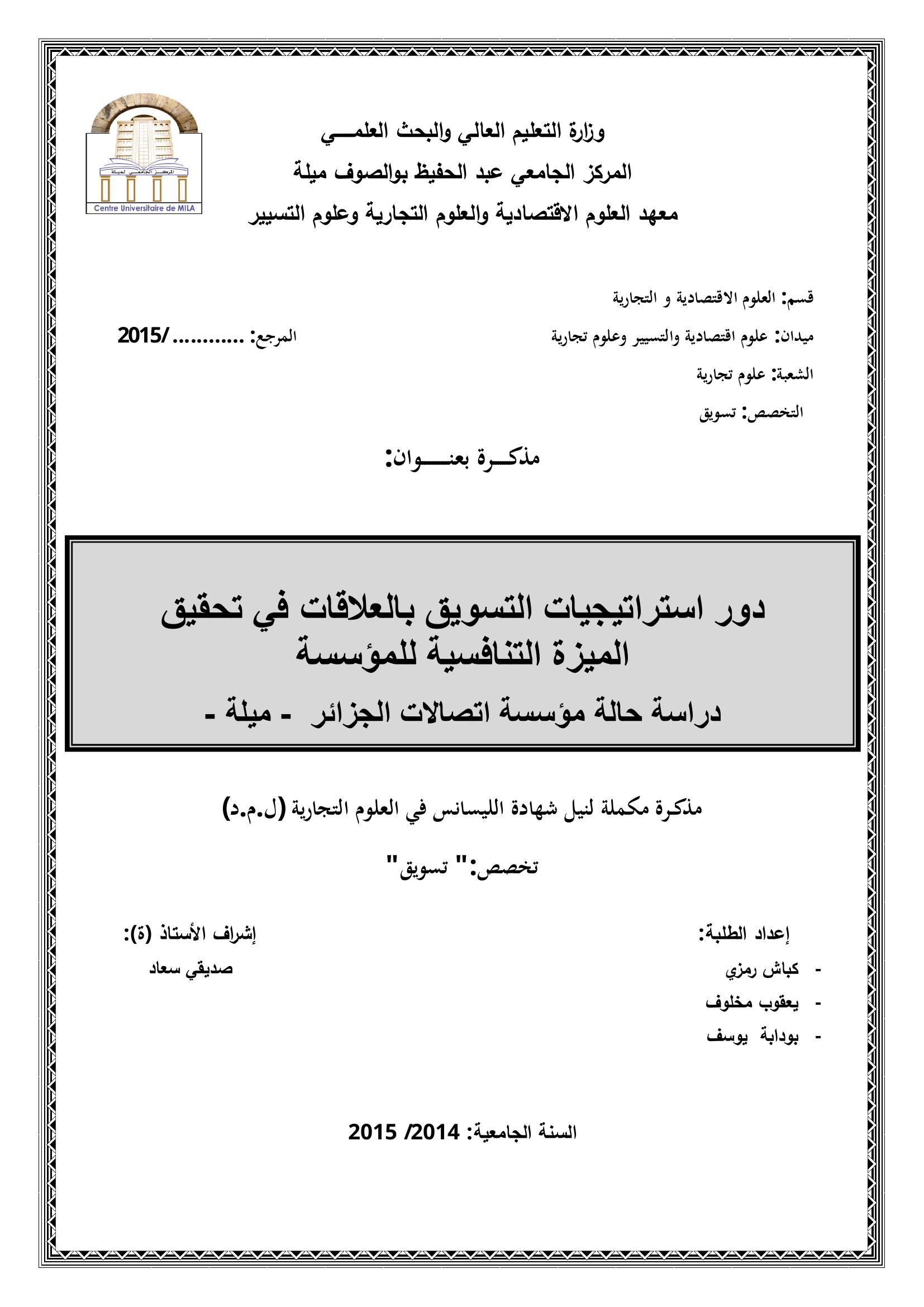 دور إستراتيجيات التسويق بالعلاقات في تحقيق الميزة التنافسية للمؤسسة : دراسة حالة مؤسسة اتصالات الجزائر -ميلة-