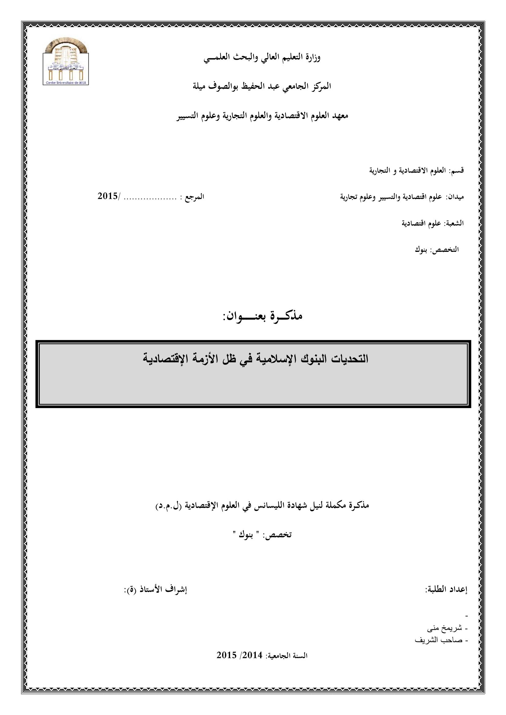بن قادري منصف & محبوب فاطمة (مشرفا) (2015). تحديات البنوك الإسلامية في ظل الأزمة الإقتصادية (ليسانس- ل م د) .