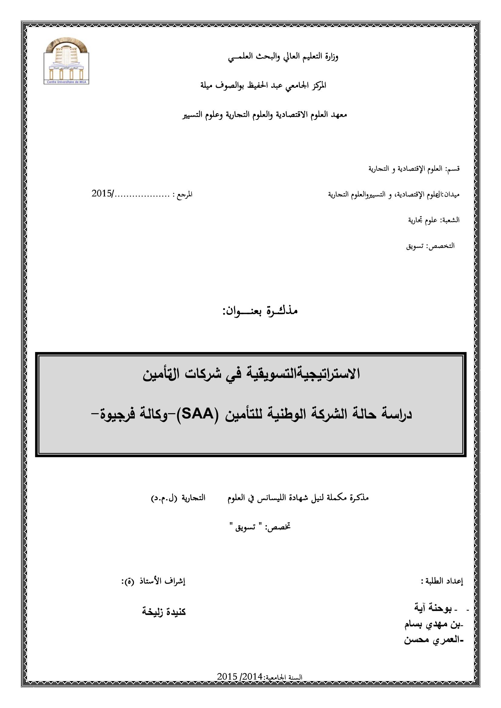 بوحنة آية & ،كنيدة زليخة(رئيسا)، لطرش جمال(مناقشا)، بوالريحان(مشرفا ومقررا) (2015). الإستراتيجية التسويقية في شركات التأمين : دراسة حالة الشركة الوطنية للتأمين (SAA) -وكالة فرجيوة-.