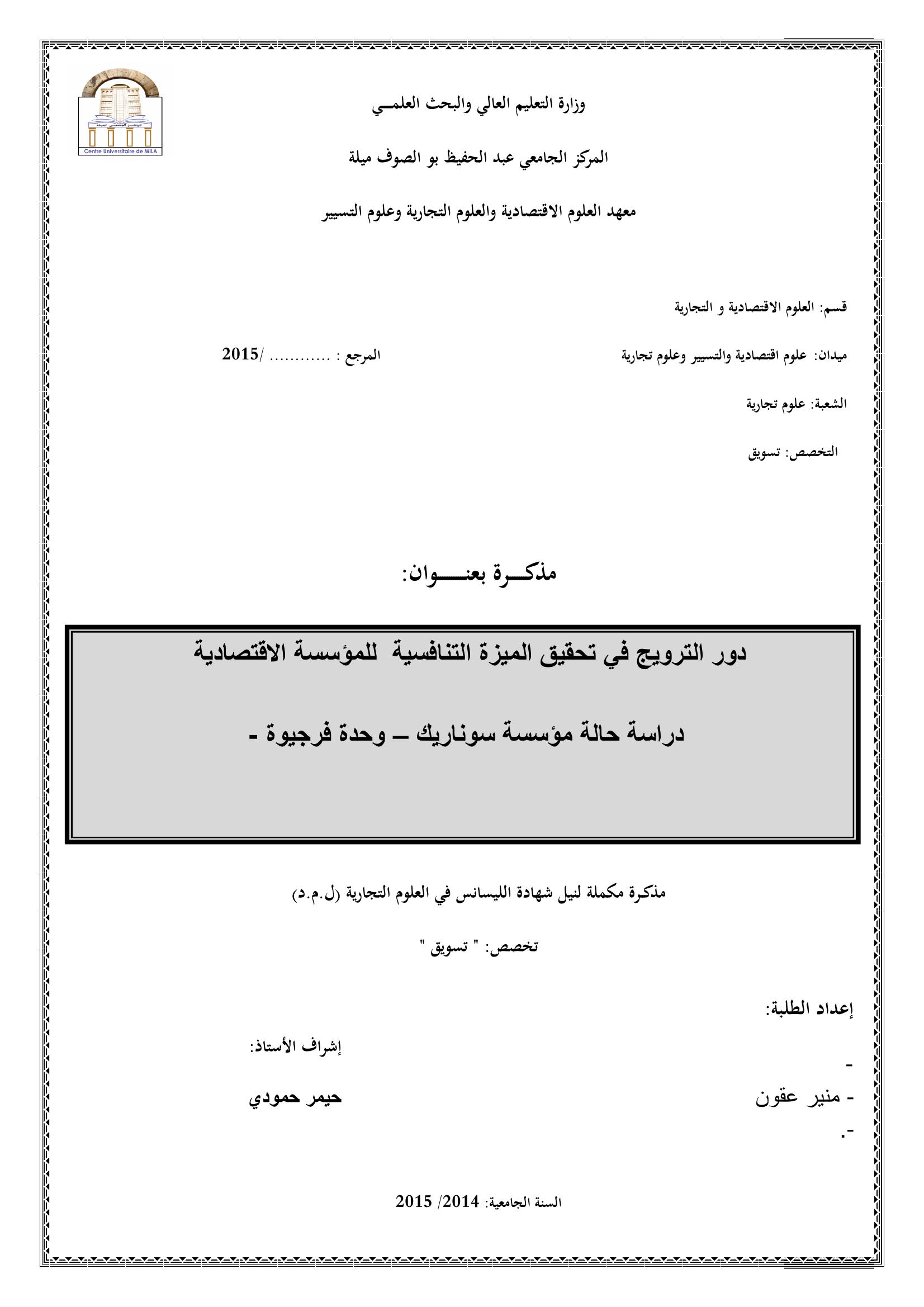 علام علي & حيمر حمودي (مشرفا) (2015). دور الترويج في تحقيق الميزة التنافسية للمؤسسة الإقتصادية : دراسة حالة مؤسسة سوناريك وحدة فرجيوة (ليسانس- ل م د) .