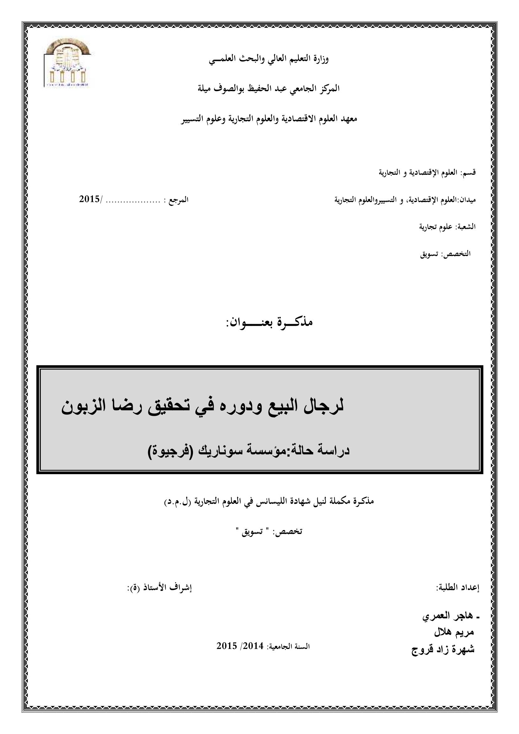 العمري هاجر & ،بلحاج طارق(رئيسا)، لطرش جمال(مناقشا)، غيش عبد العالي(مشرفا ومقررا) (2015). السلوك الأخلاقي لرجال البيع ودوره في تحقيق رضا الزبون: دراسة حالة مؤسسة سوناريك (فرجيوة) (ليسانس- ل م د) .