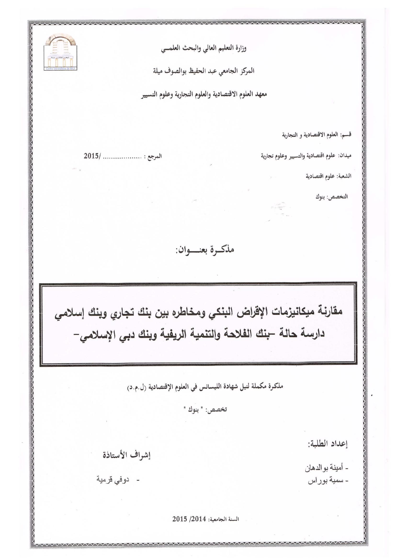 بوالدهان أمينة & دوفي قرمية(مشرفا) (2015). مقارنة ميكانيزمات الإقراض البنكي ومخاطره بين بنك تجاري وبنك إسلامي : دراسة حالة -بنك الفلاحة والتنمية الريفية وبنك دبي الإسلامي-.