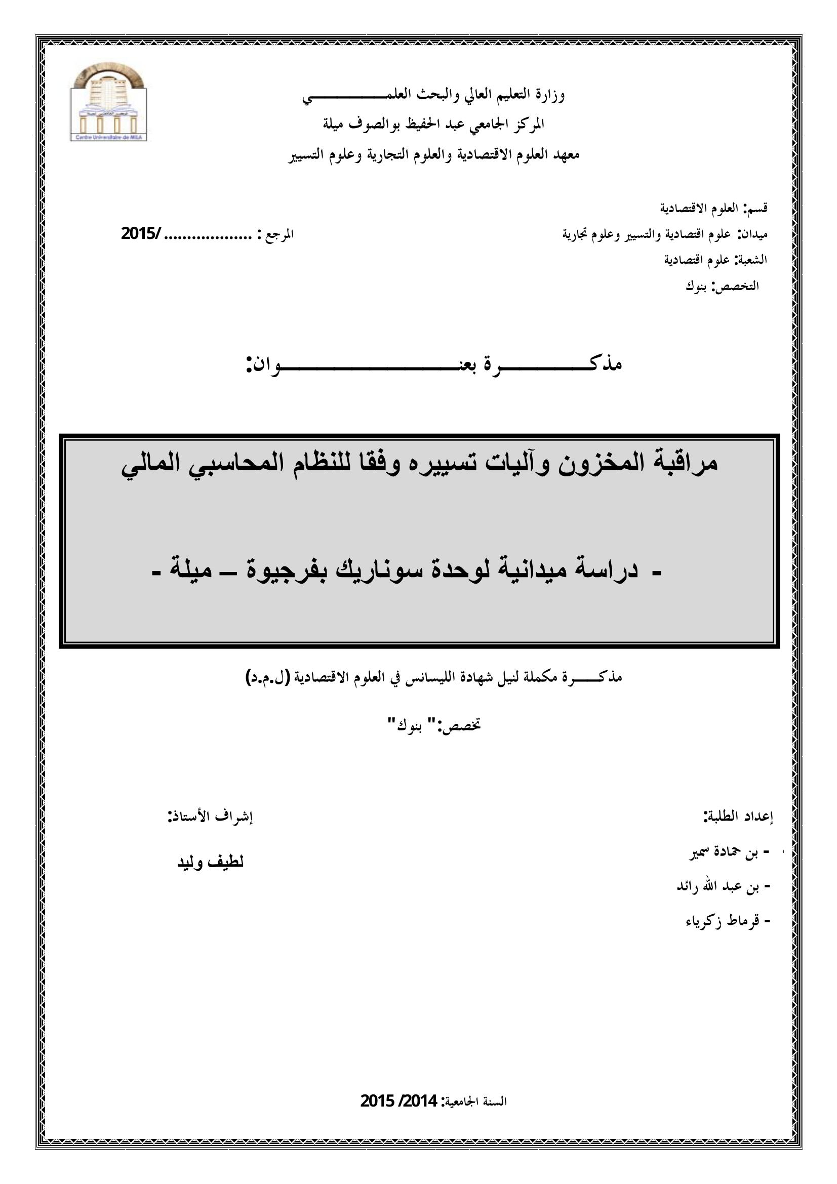 بن حمادة سمير & لطيف وليد (مشرفا) (2015). مراقبة المخزون وآليات تسييره وفقا للنظام المحاسبي المالي -دراسة ميدانية لوحدة سوناريك بفرجيوة -ميلة-.