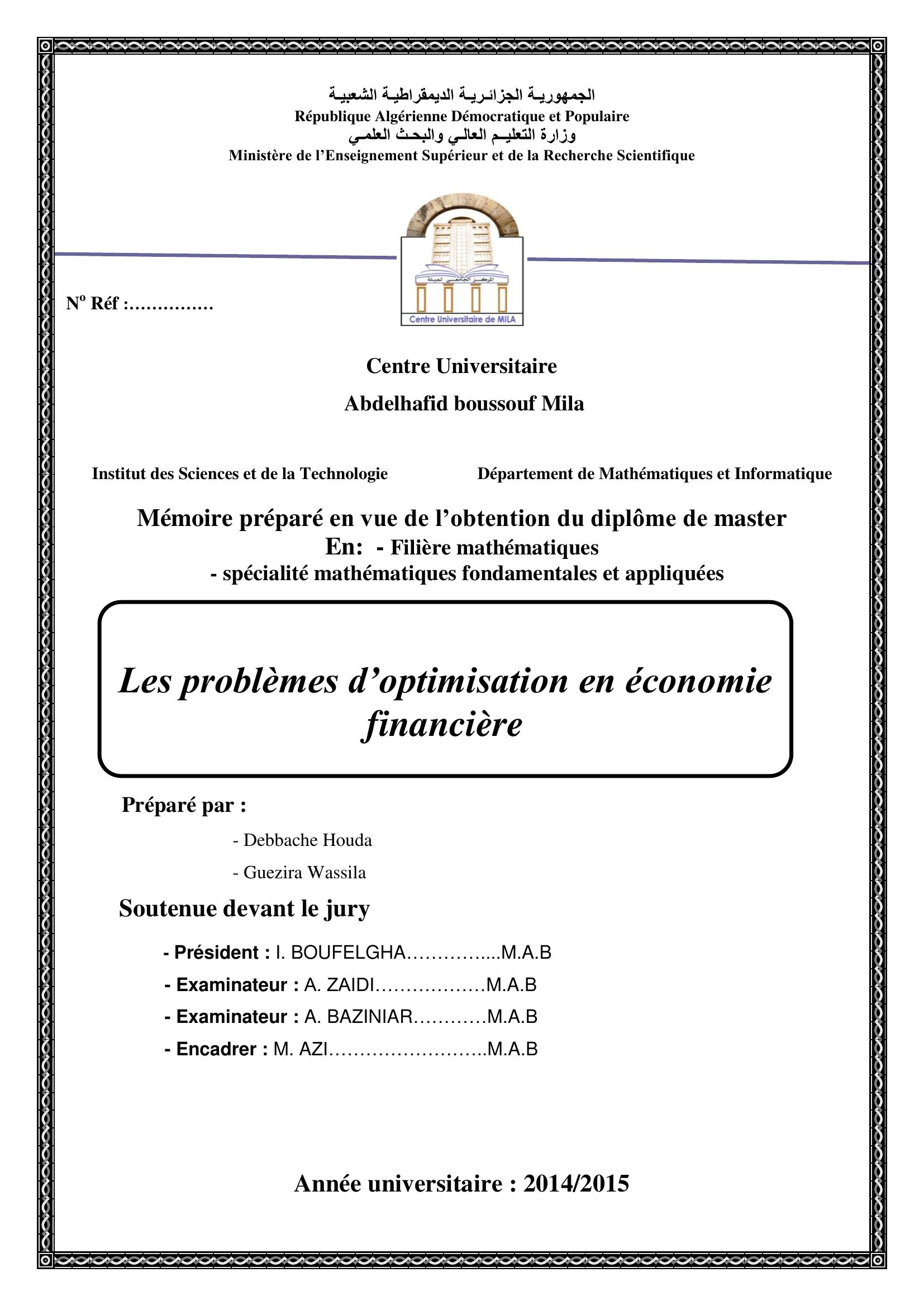 Debbache Houda & BOUFELGHA .l(Président), Z. (2015). Les Problèmes d'optimisation en économie financière.