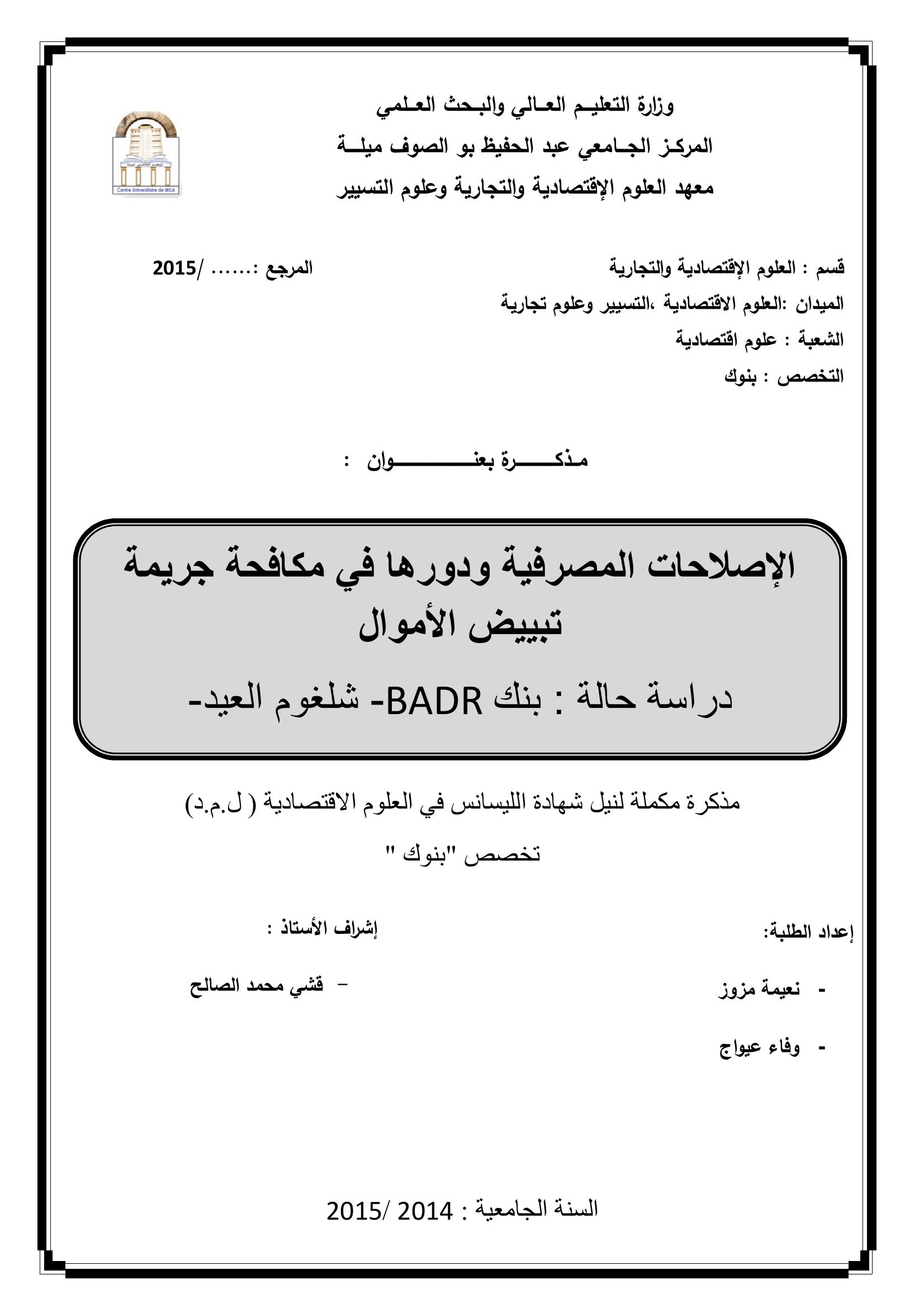 مزوز نعيمة & قشي محمد الصالح(مشرفا) (2015). الإصلاحات المصرفية ودورها في مكافحة جريمة تبييض الأموال : دراسة حالة بنك BADR - شلغوم العيد-.