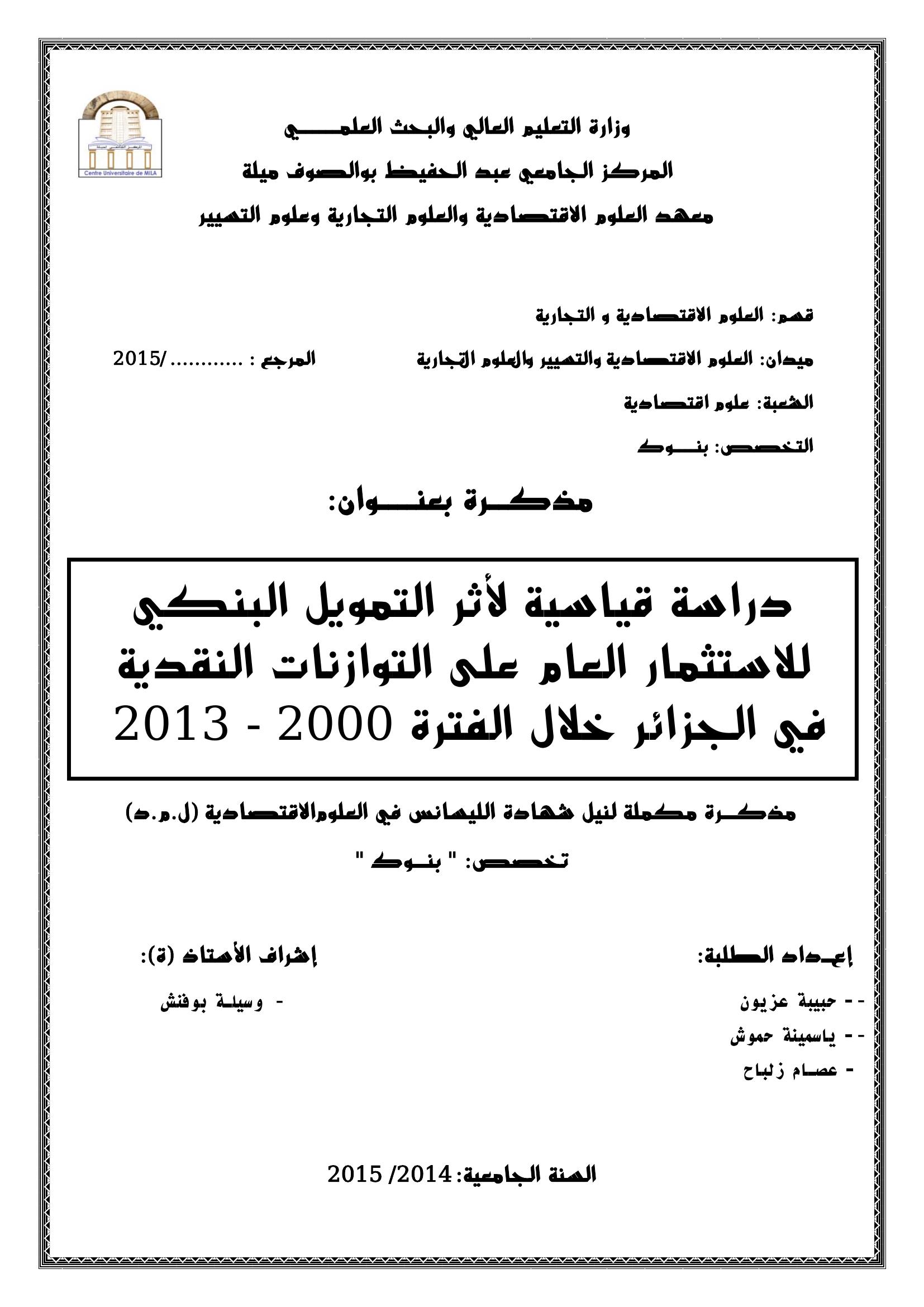 عزيون حبيبة & بوفنش وسيلة(مشرفا) (2015). دراسة قياسية لأثر التمويل البنكي للإستثمار العام على التوازنات النقدية في الجزائر خلال الفترة 2000-2013.