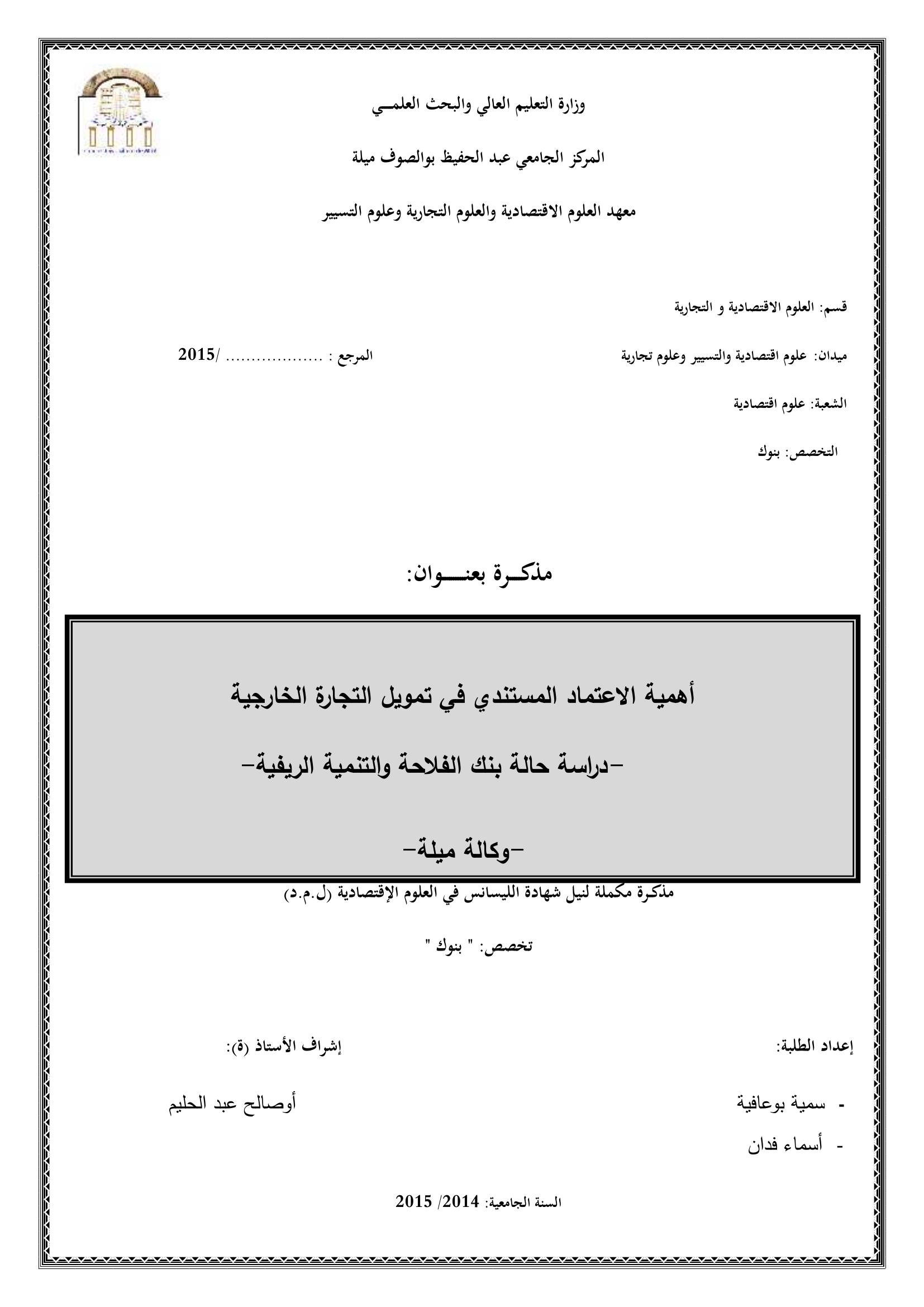 أهمية الإعتماد المستندي في تمويل التجارة الخارجية : دراسة حالة بنك الفلاحة والتنمية الريفية -وكالة ميلة-