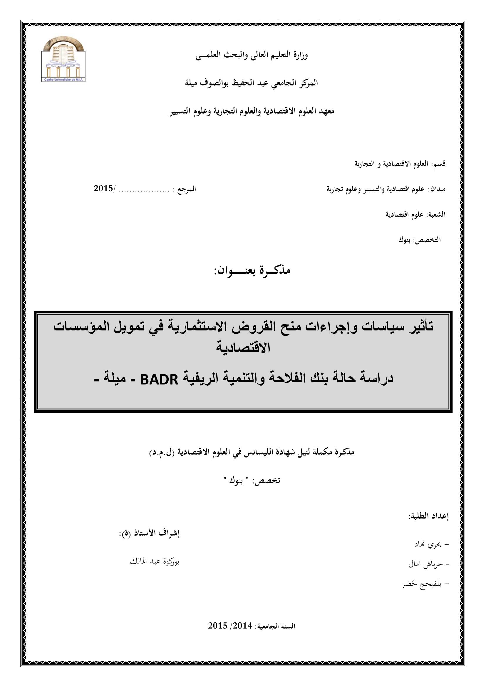 بحري نهاد & بوركوة عبد المالك(مشرفا) (2015). تأثير سياسات وإجراءات منح القروض الإستثمارية في تمويل المؤسسات الإقتصادية : دراسة حالة بنك الفلاحة والتنمية الريفية BADR -ميلة-.