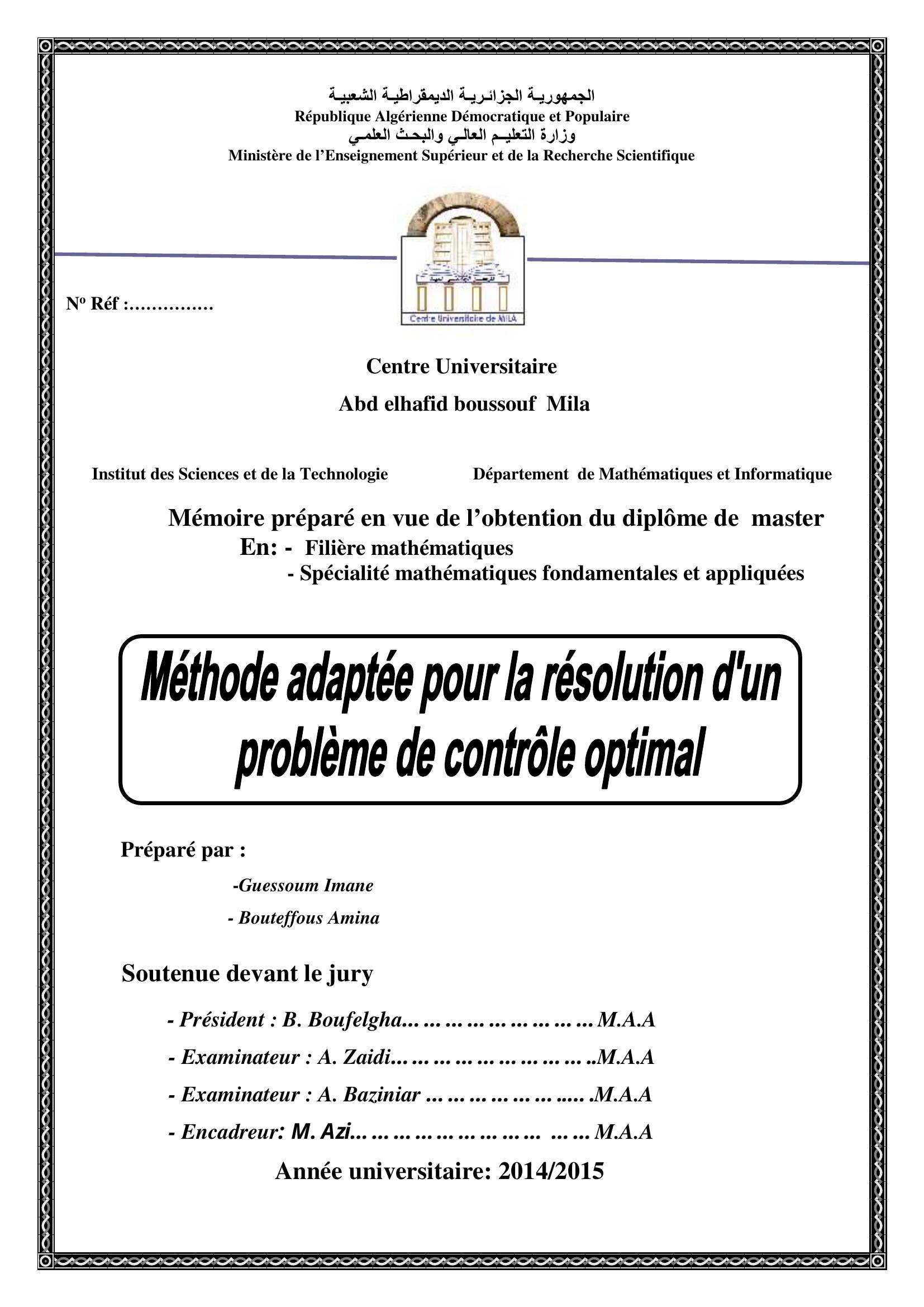 Guessoum Imen & Boufelgha .B(Président), Z. (2015). Méthode adaptée pour la résolution d'un problème de controle optimal.