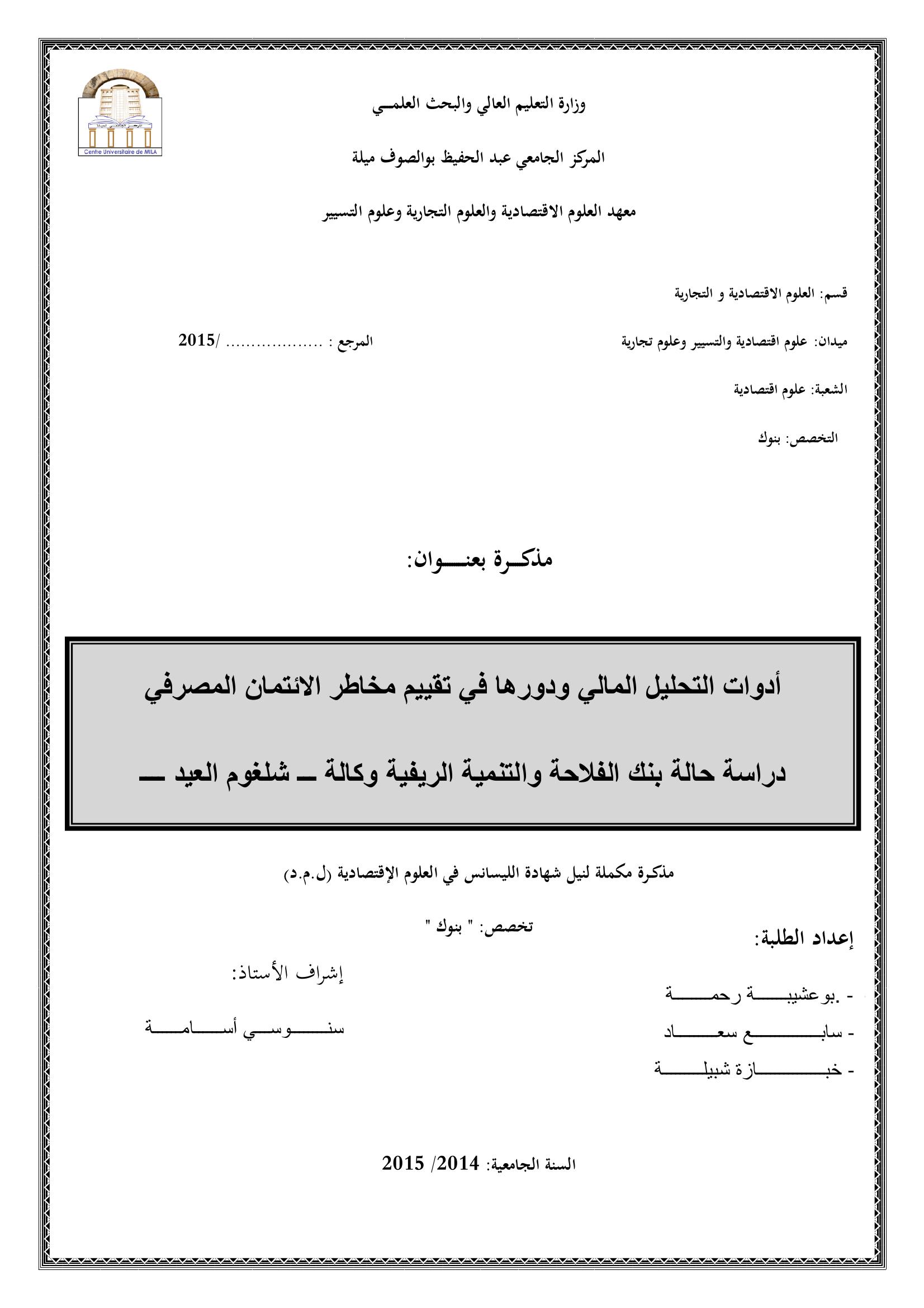 أدوات التحليل المالي ودورها في تقييم مخاطر الإئتمان المصرفي : دراسة حالة بنك الفلاحة والتنمية الريفية وكالة -شلغوم العيد-