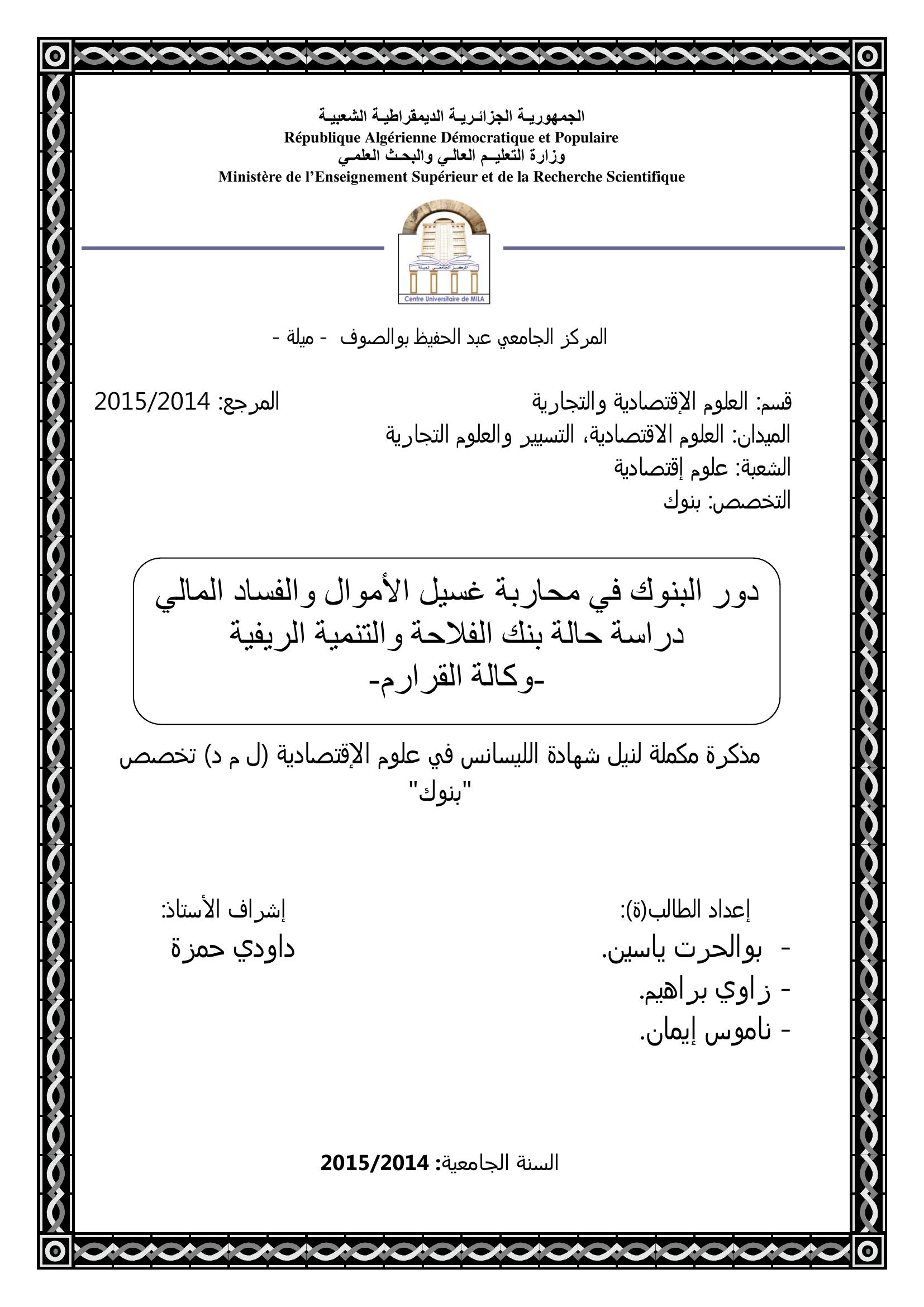 بوالحرت ياسين & داودي حمزة (مشرفا) (2015). دور البنوك في محاربة غسيل الأموال والفساد المالي : دراسة حالة بنك الفلاحة والتنمية الريفية -وكالة القرارم-.