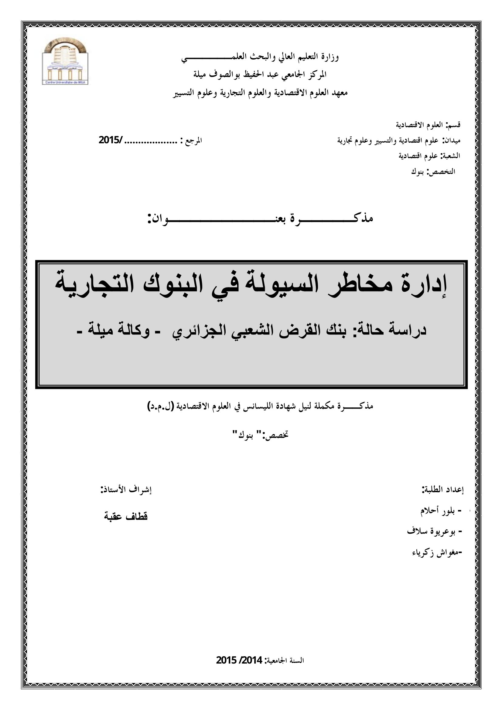 بلور أحلام & قطاف عقبة(مشرفا) (2015). إدارة مخاطر السيولة في البنوك التجارية دراسة حالة بنك القرض الشعبي الجزائري -وكالة ميلة-.