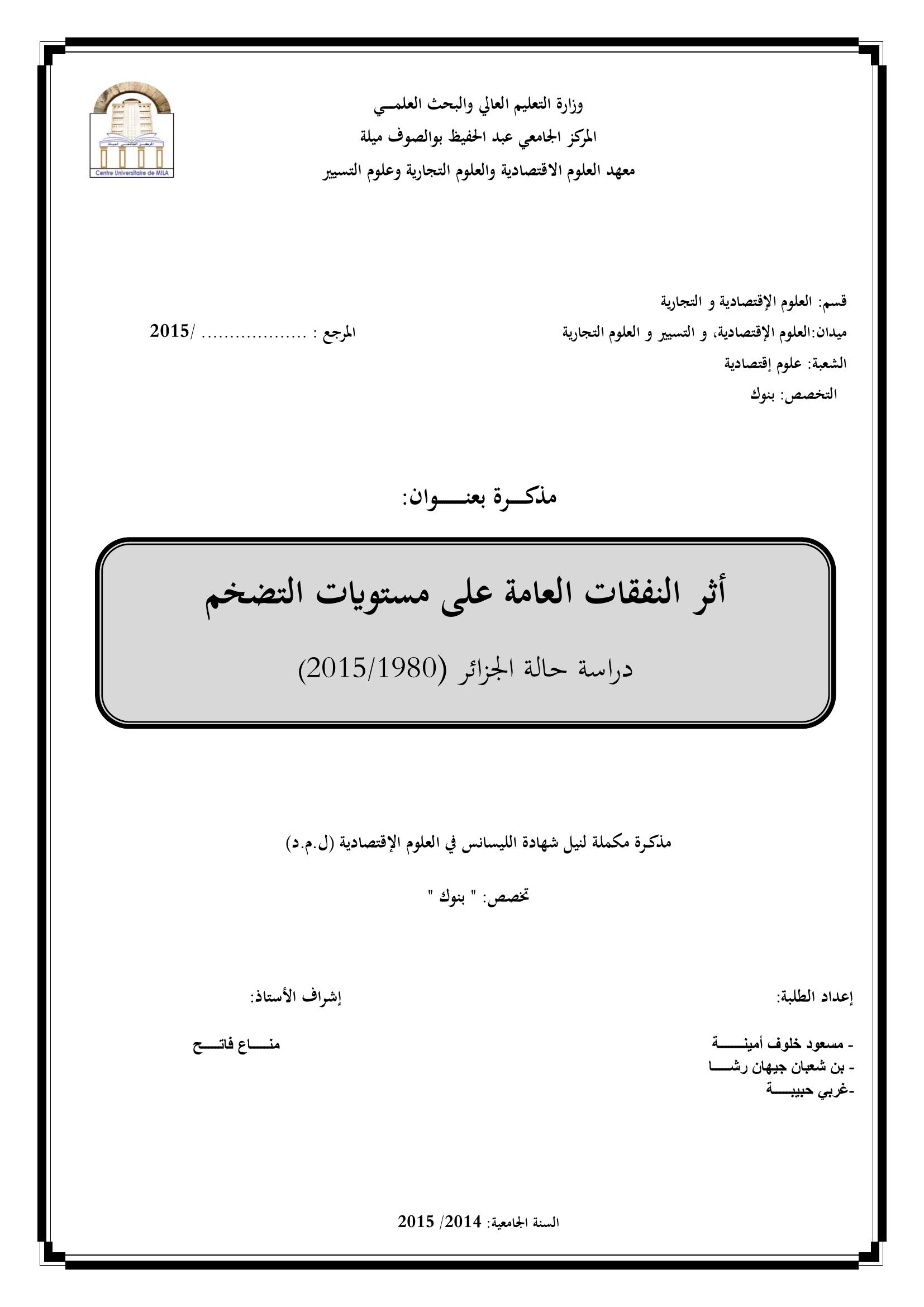 مسعود خلوف أمينة & مرزوقي ياسر (مشرفا) (2015). أثر النفقات العامة على مستويات التضخم دراسة حالة الجزائر (2015/1980).