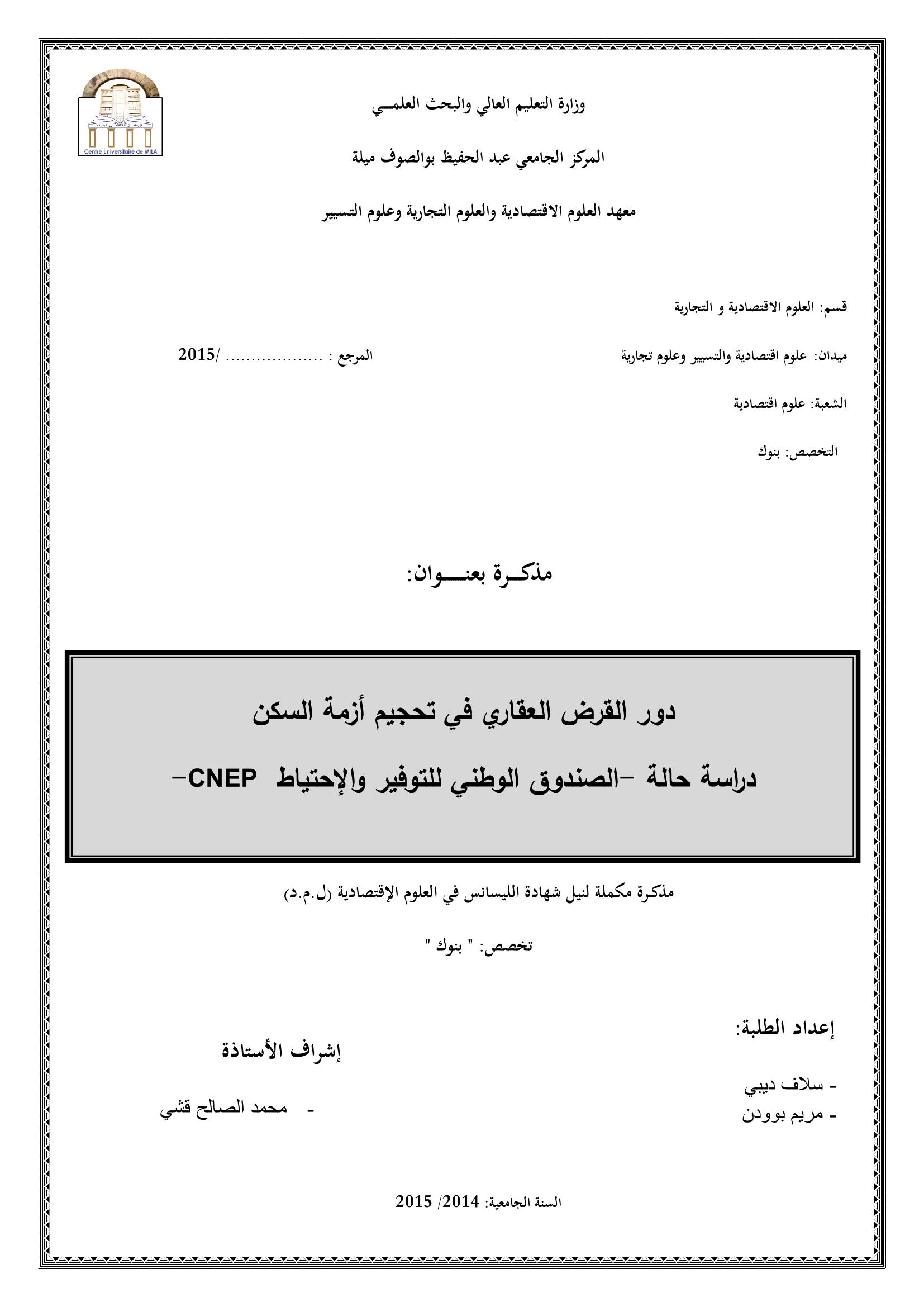 ديبي سلاف & قشي محمد الصالح(مشرفا) (2015). دور القرض العقاري في تحجيم أزمة السكن دراسة حالة الصندوق الوطني للتوفير والإحتياط CNEP.
