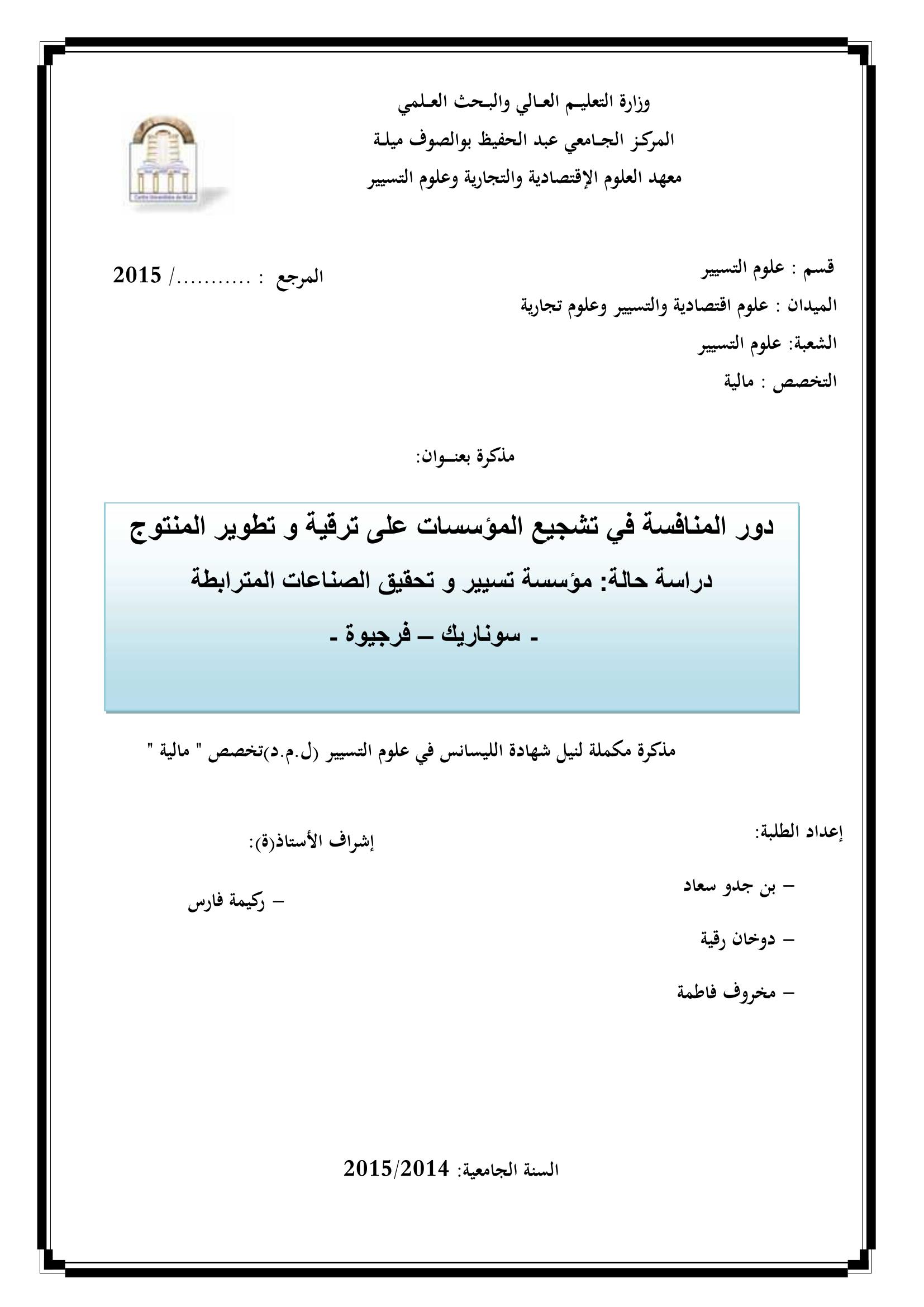 بن جدو سعاد & ركيمة فارس (مشرفا) (2015). دور المنافسة في تشجيع المؤسسات على ترقية وتطوير المنتوج دراسة حالة مؤسسة تسيير وتحقيق الصناعات المتلرابطة سوناريك فرجيوة.
