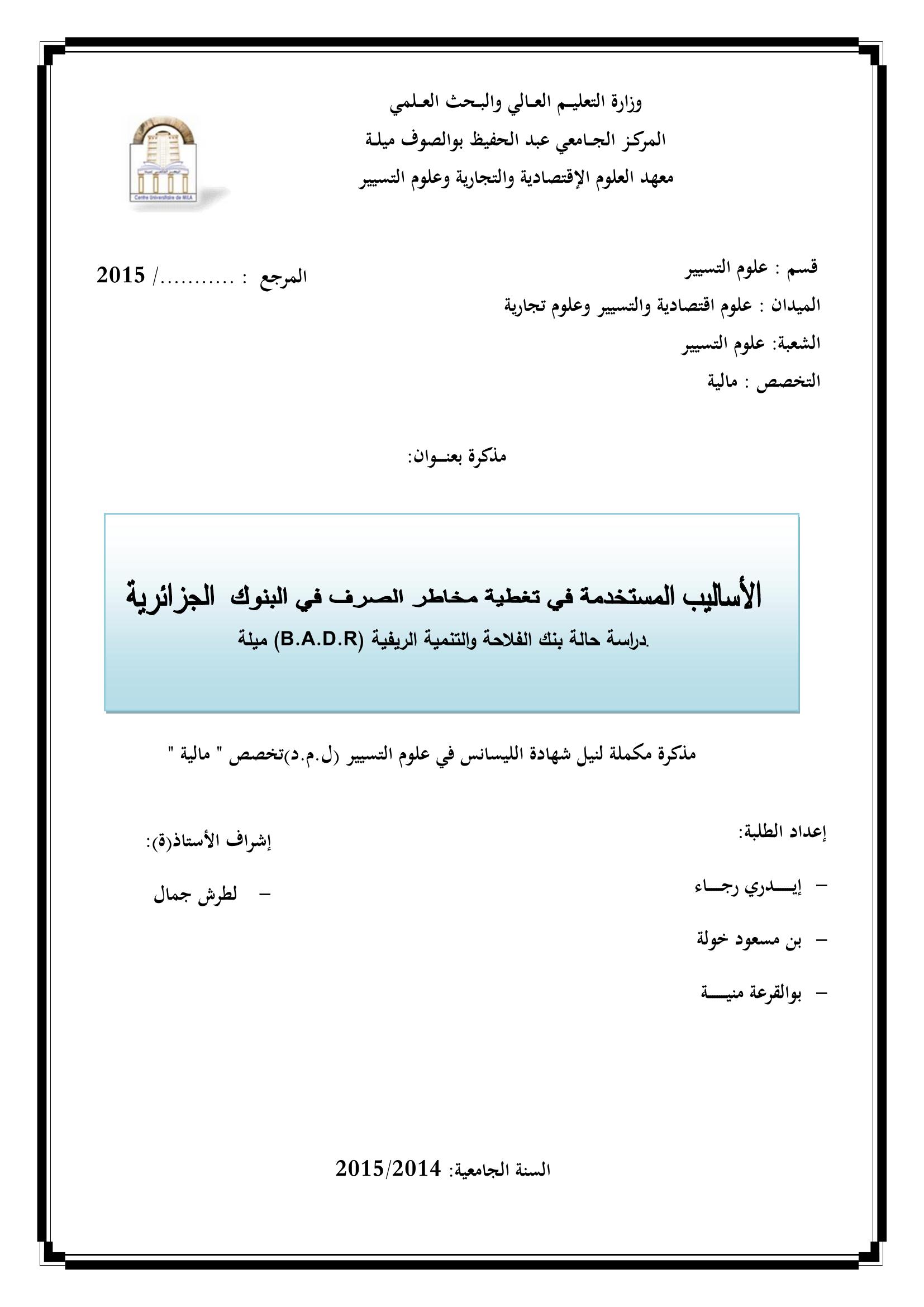 إيدري رجاء & لطرش جمال(مشرفا) (2015). الأساليب المستخدمة في تغطية مخاطر الصرف في البنوك الجزائرية : دراسة حالة بنك الفلاحة والتمية الريفية (B.A.D.R) ميلة.