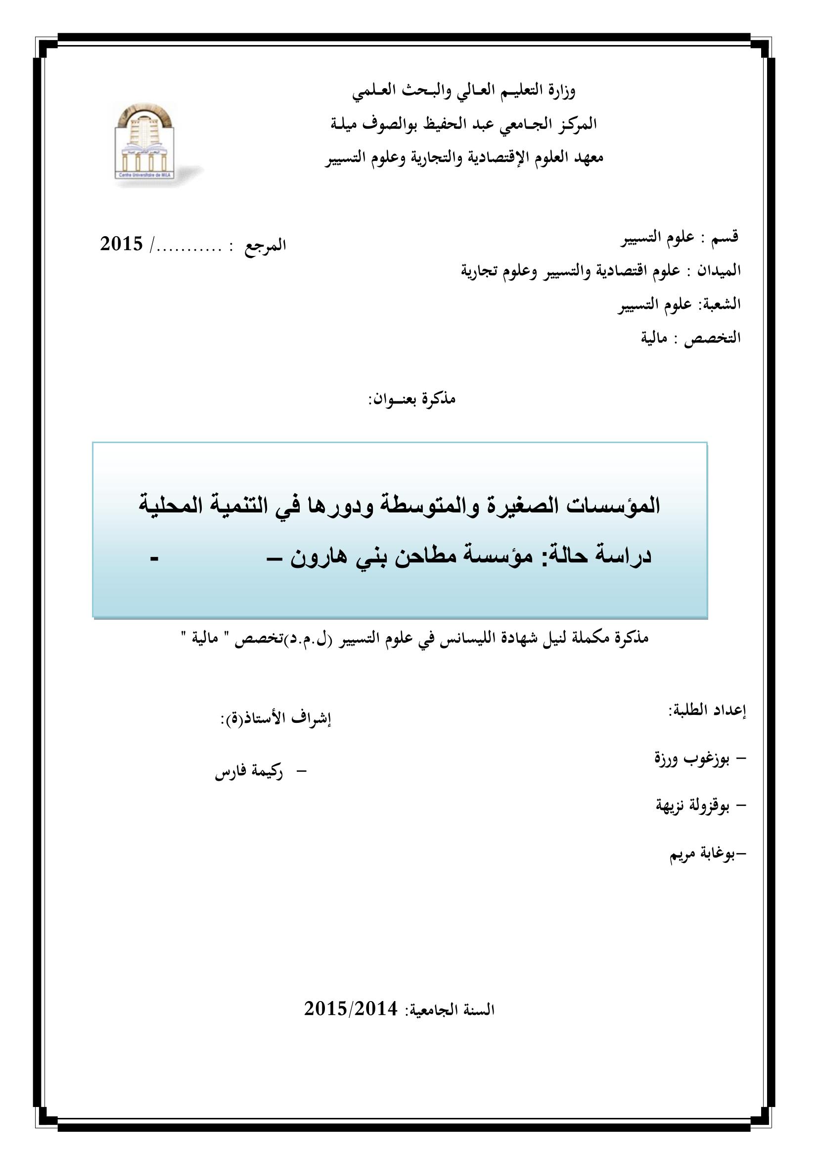 بوزغوب وردة & ركيمة فارس (مشرفا) (2015). المؤسسات الصغيرة والمتوسطة ودورها في التنمية المحلية : دراسة حالة مؤسسة مطاحن بني هارون -القرارم قوقة.