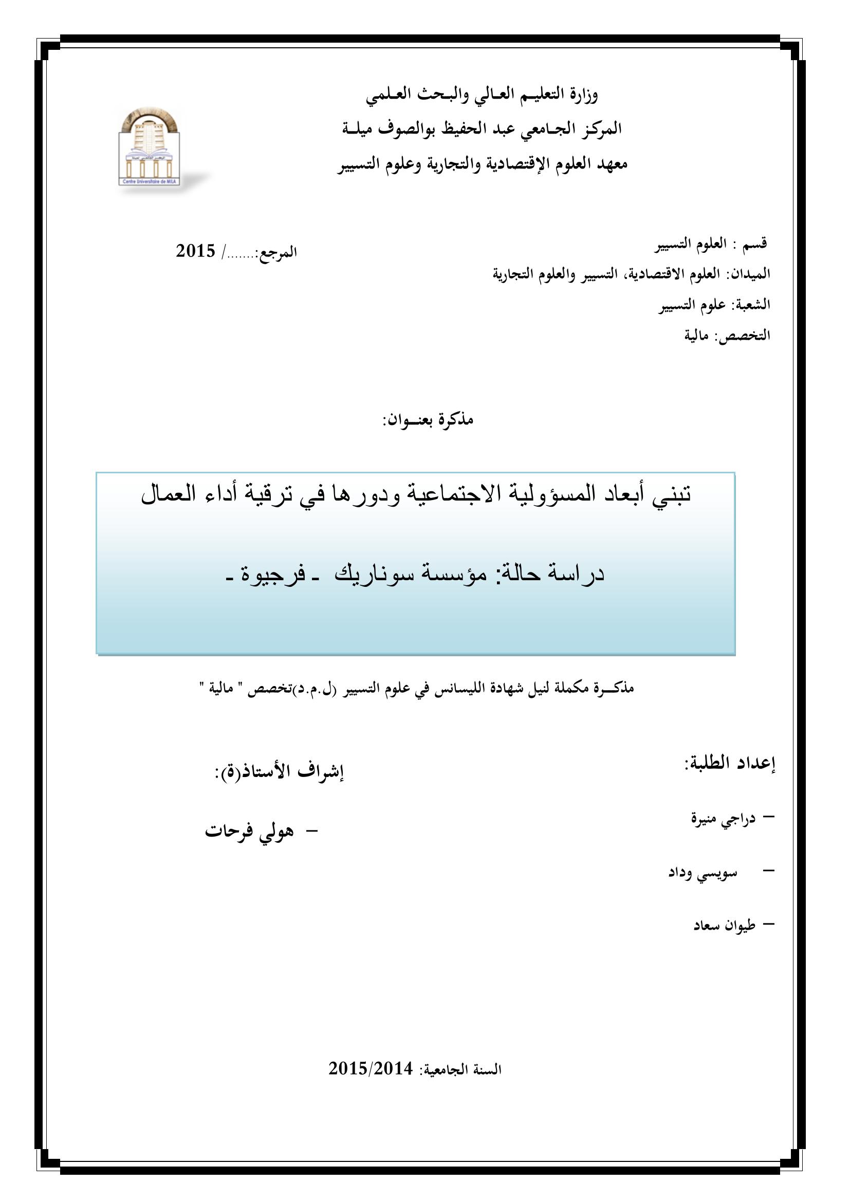 دراجي منيرة & هولي فرحات (مشرفا) (2015). تبني أبعاد المسؤولية الإجتماعية ودورها في ترقية أداء العمال : دراسة حالة مؤسسة سوناريك -فرجيوة-.