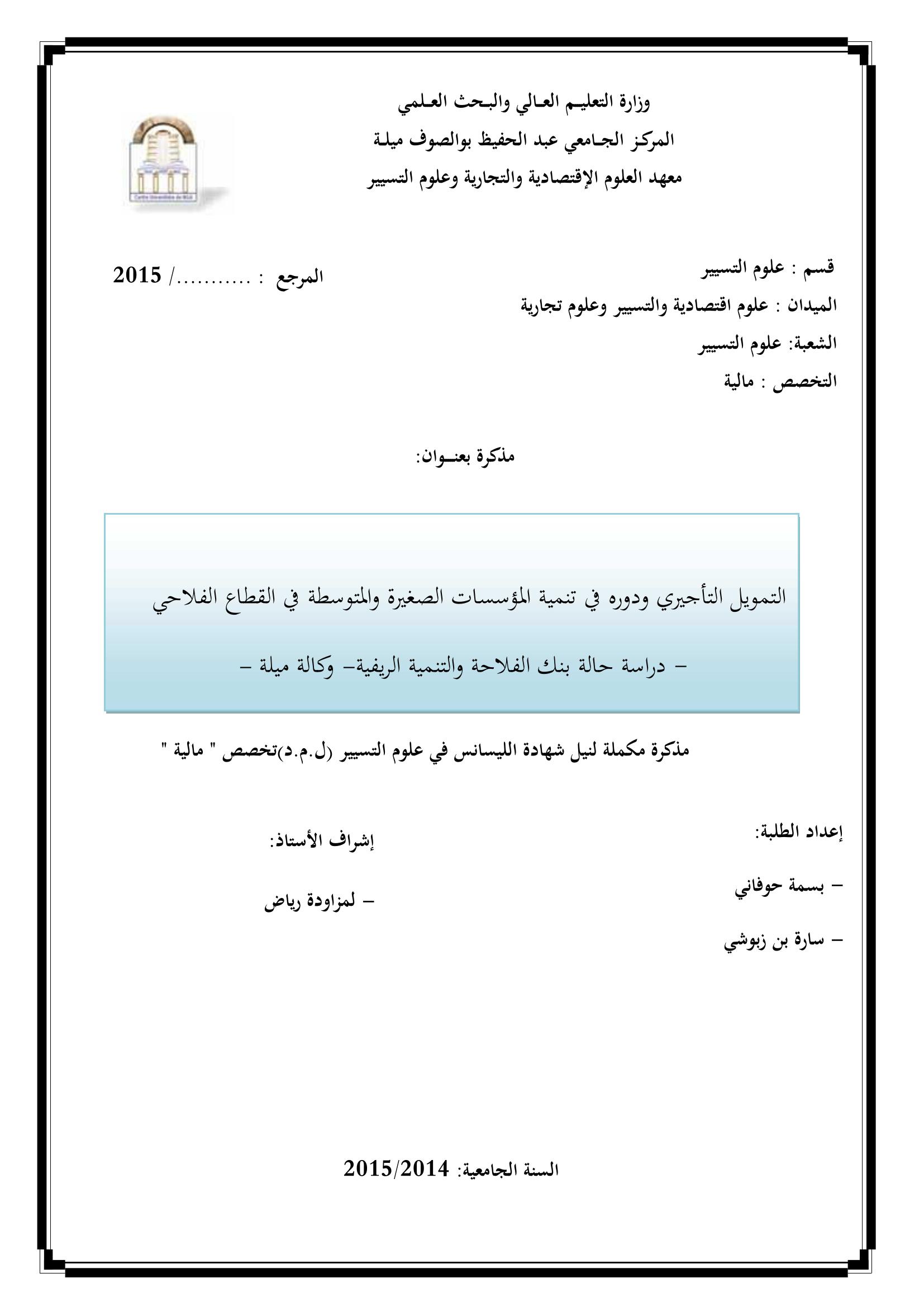 حوفاني بسمة & لمزاودة رياض (مشرفا) (2015). التمويل التأجيري ودوره في تنمية المؤسسات الصغيرة والمتوسطة في القطاع الفلاحي.