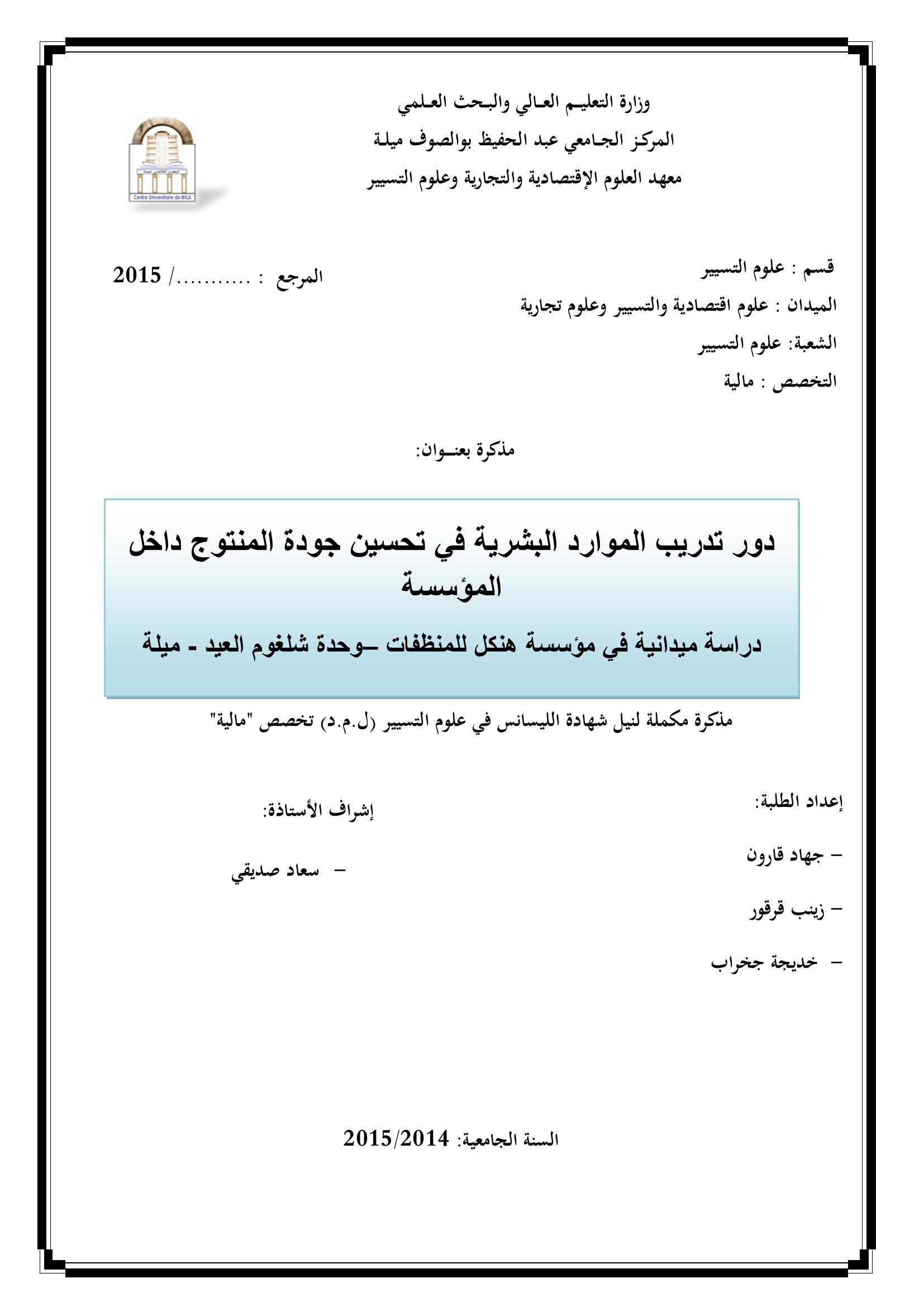 قارون جهاد & صديقي سعاد(مشرفا) (2015). دور تدريب الموارد البشرية في تحسين جودة المنتوج داخل المؤسسة : دراسة ميدانية في مؤسسة هنكل للمنظفات وحدة شلغوم العيد ميلة.