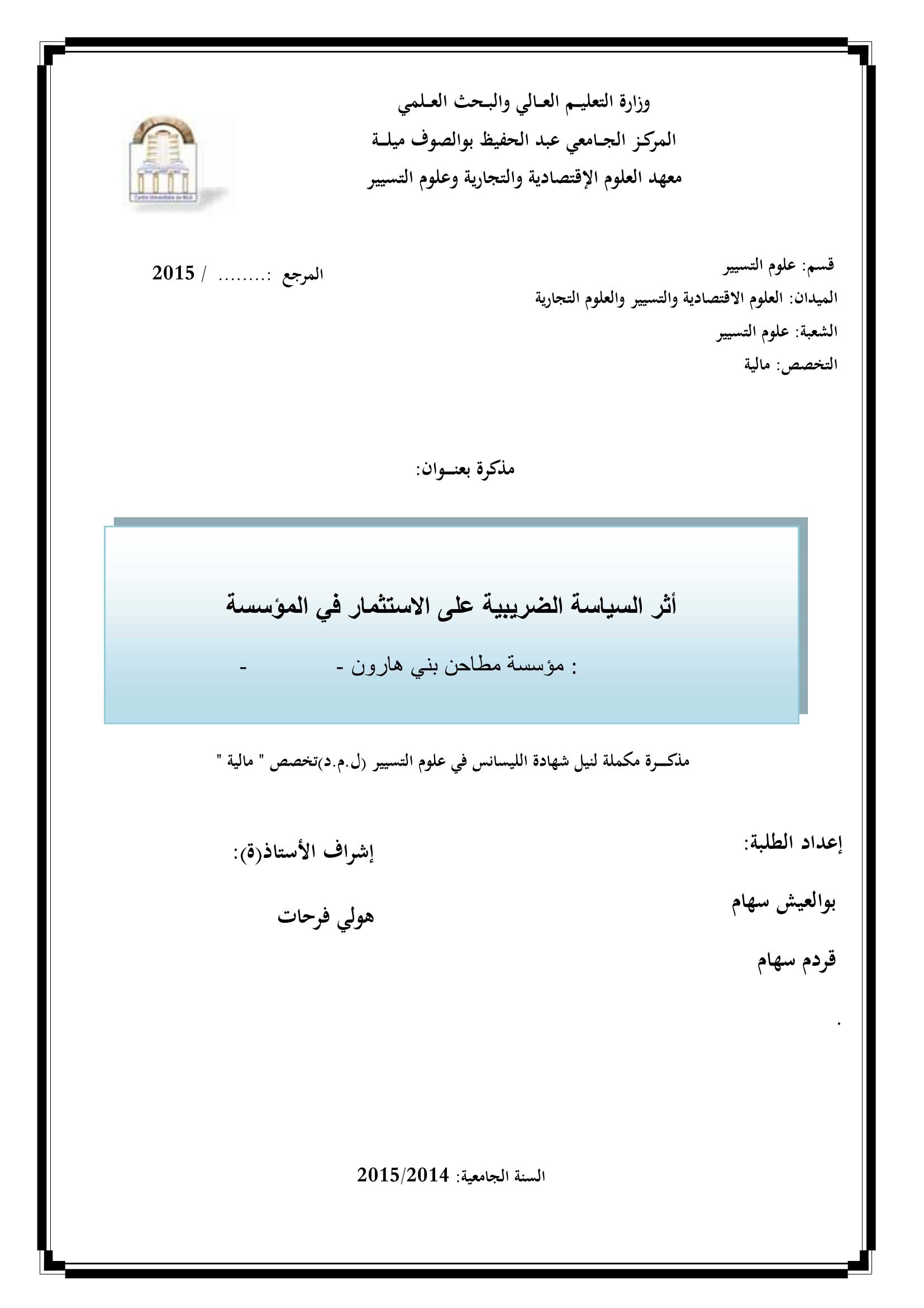 بوالعيش سهام & هولي فرحات (مشرفا) (2015). أثر السياسة الضريبية على الإستثمار في المؤسسة :دراسة حالة مؤسسة مطاحن بني هارون لقرارم قوقة.