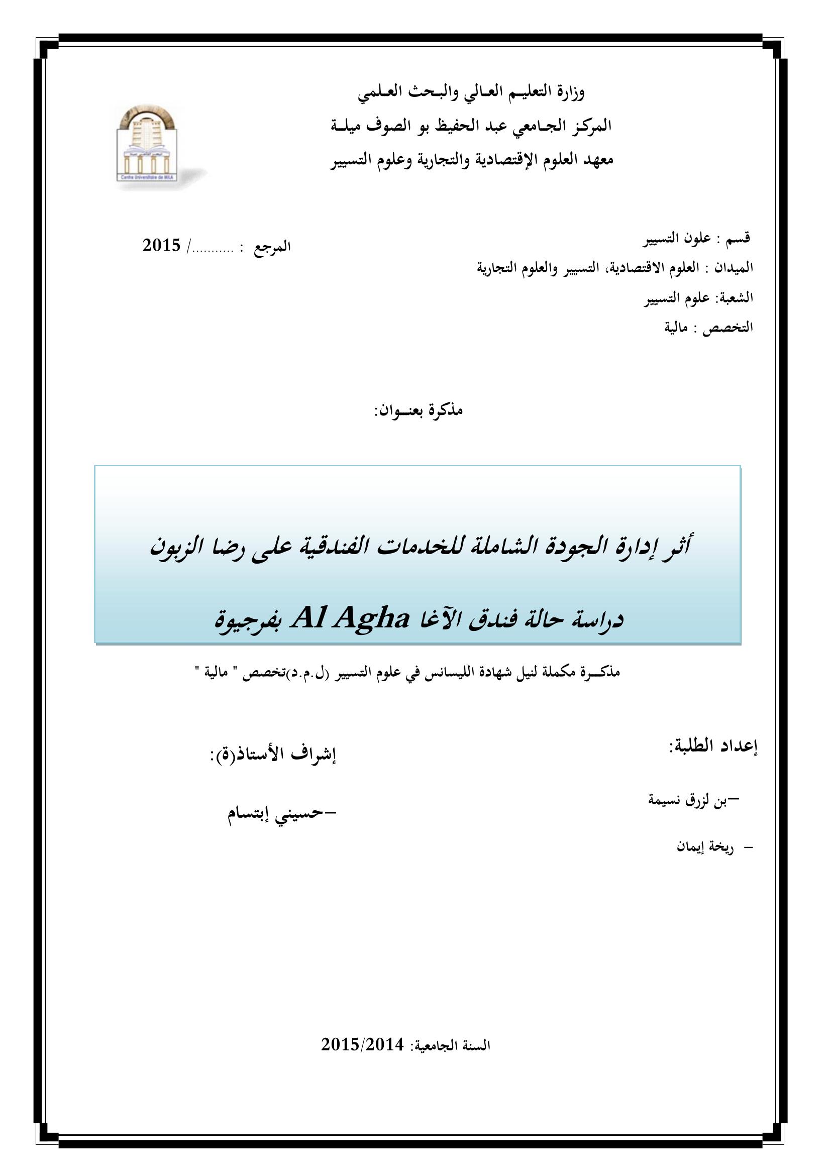 بن لزرق نسيمة & حسيني ابتسام(مشرفا) (2015). أثر إدارة الجودة الشاملة للخدمات الفندقية على رضا الزبون :دراسة حالة فندق الآغا AL AGHA بفرجيوة.