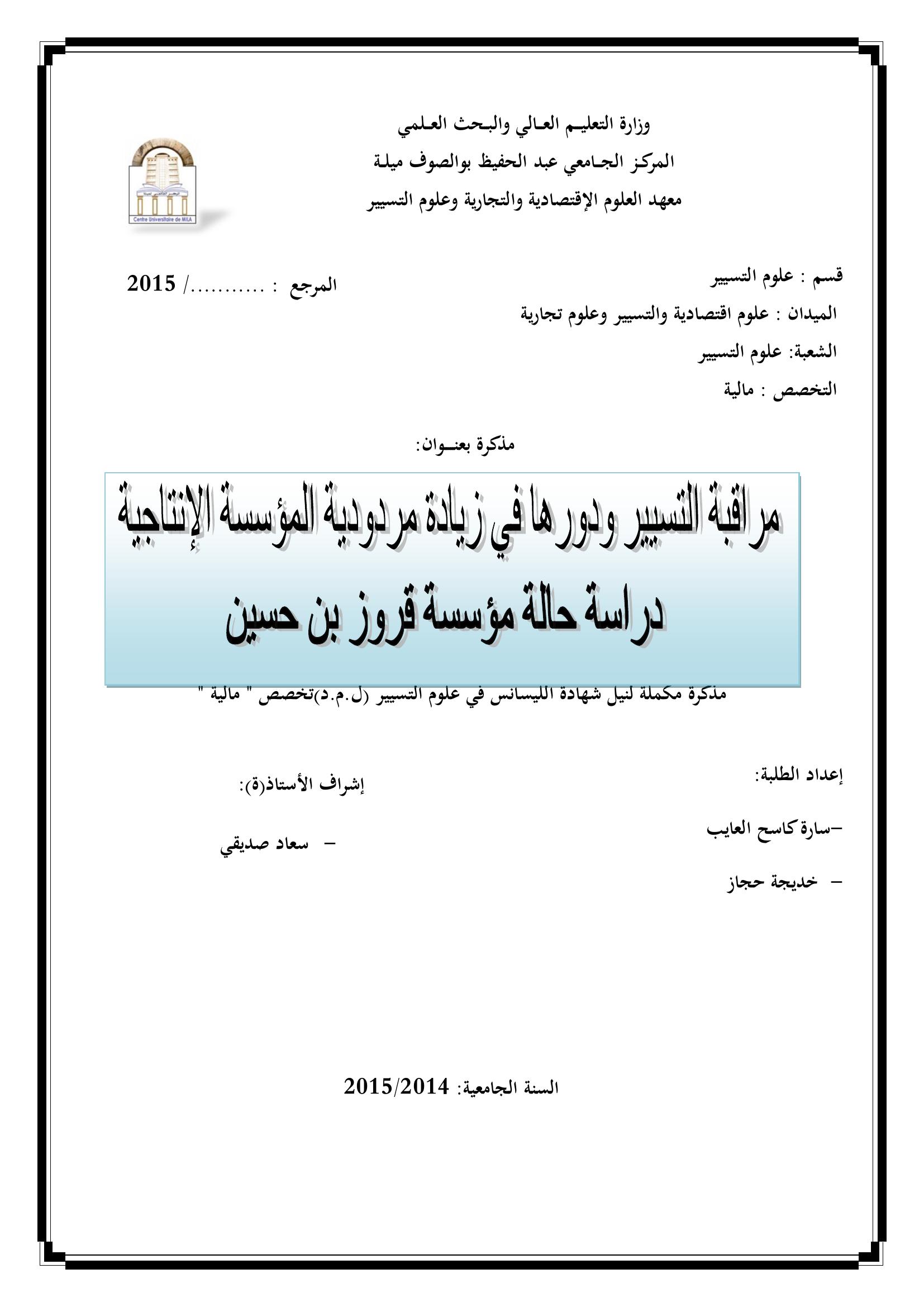 كاسح العايب سارة & صديقي سعاد(مشرفا) (2015). مراقبة التسيير ودورها في زيادة مردودية المؤسسة الإنتاجية : دراسة حالة مؤسسة قروز بن حسين.