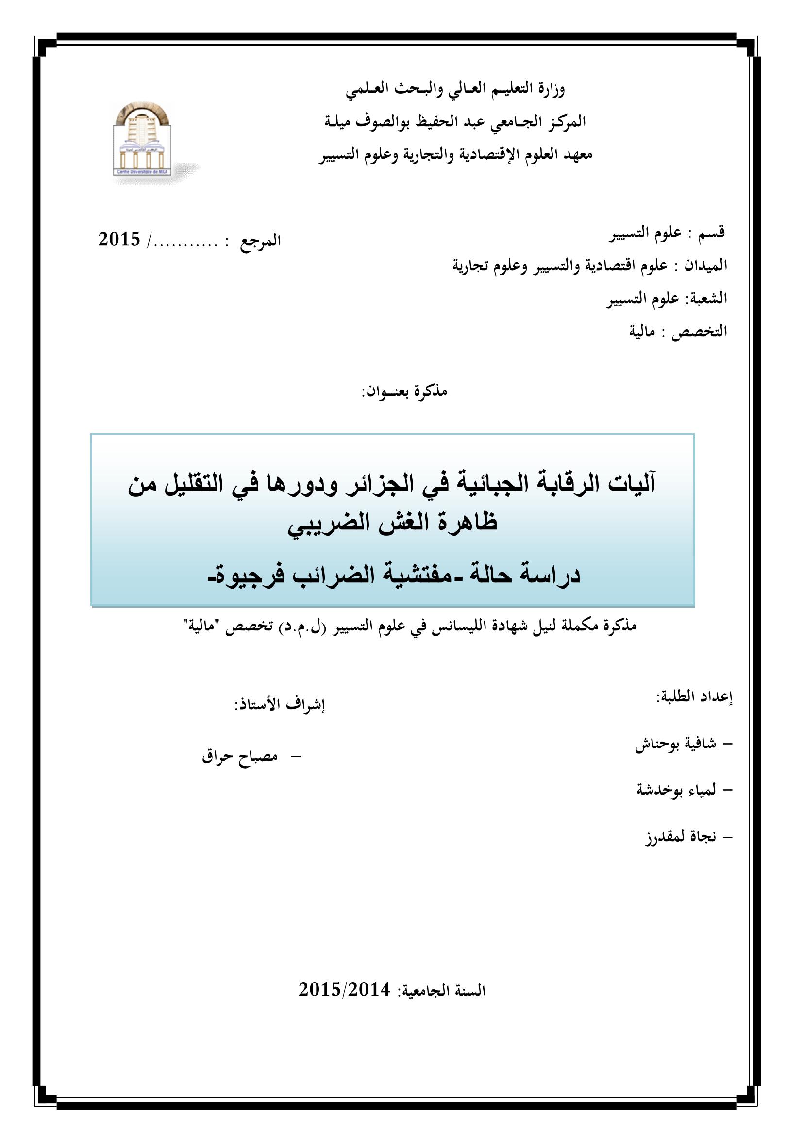 آليات الرقابة الجبائية في الجزائر ودورها في التقليل من ظاهرة الغش الضريبي :دراسة حالة مفتشية الضرائب فرجيوة