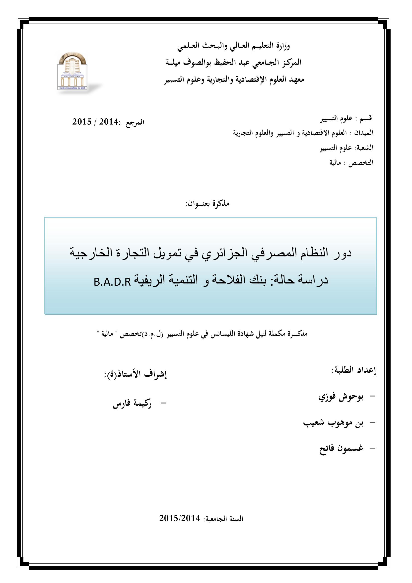 بوحوش فوزي & ركيمة فارس (مشرفا) (2015). دور النظام المصرفي الجزائري في تمويل التجارة الخارجية : دراسة حالة بنك الفلاحة والتنمية الريفية B.A.D.R.