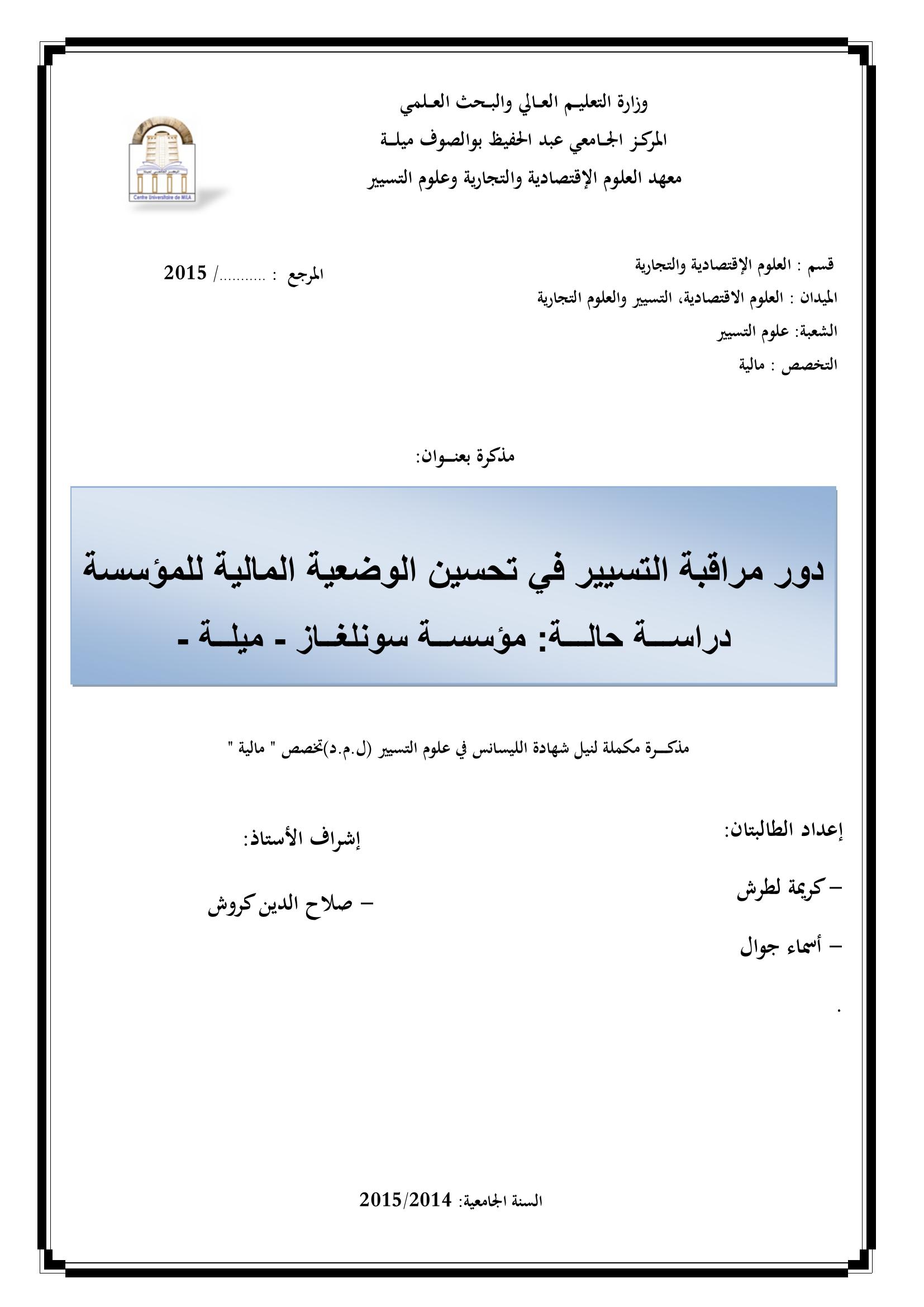 لطرش كريمة & كروش صلاح الدين(مشرفا) (2015). دور مراقبة التسيير في تحسين الوضعية المالية للمؤسسة : دراسة حالة مؤسسة سونلغاز-ميلة-.
