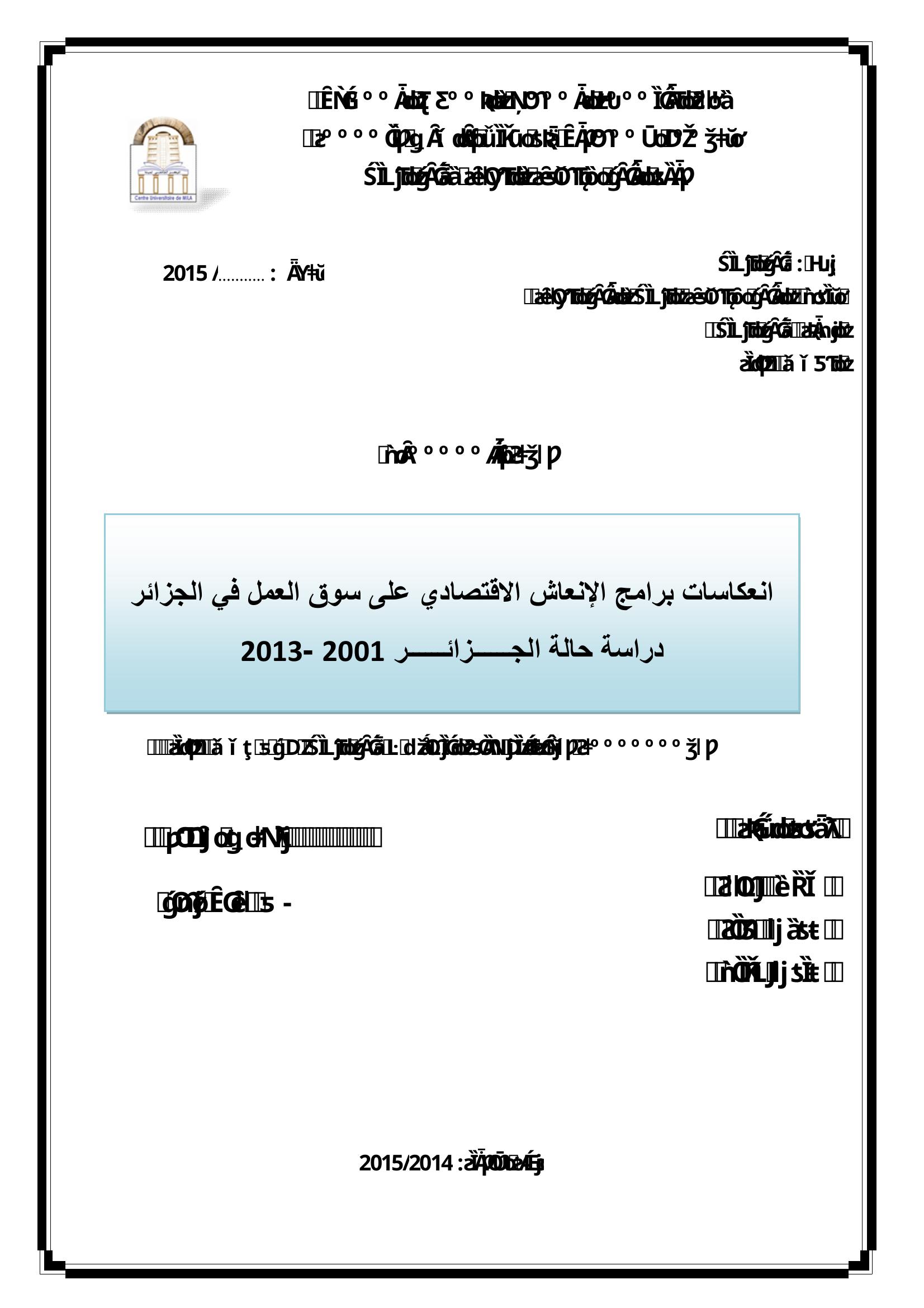 صلاي سارة & ريغي هشام (مشرفا) (2015). إنعكاسات برامج الإنعاش الإقتصادي على سوق العمل في الجزائر : دراسة حالة الجزائر 2001-2013.