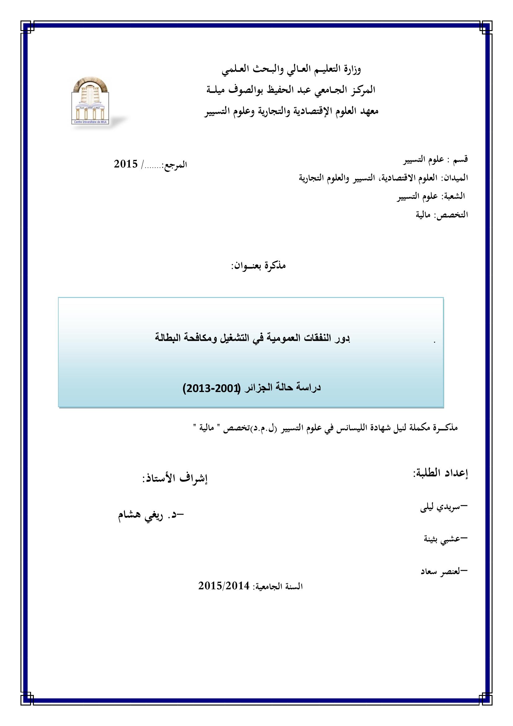 سريدي ليلى & ريغي هشام (مشرفا) (2015). دور النفقات العمومية في التشغيل ومكافحة البطالة دراسة حالة الجزائر (2001-2013).