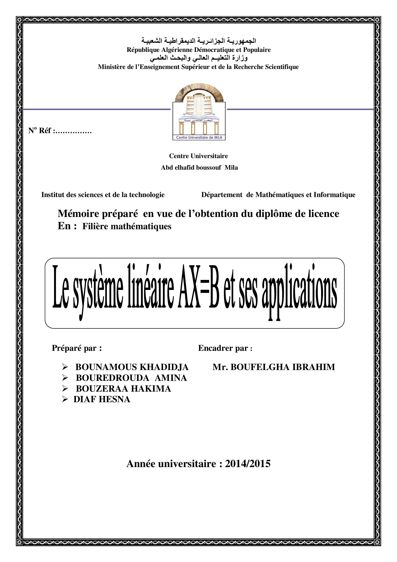 Bounamous Khadidja & BOUFELGHA IBRAHIM encadreur (2015). Le système linéaire AX=B et ses applications.