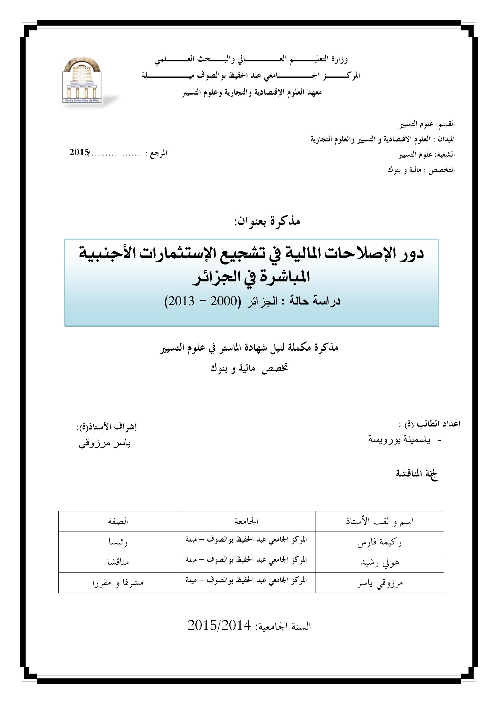 بورويسة ياسمينة & ،ركيمة فارس (رئيسا) ، هولي رشيد (مناقشا) ، مرزوقي ياسر (مشرفا ومقررا) (2015). دور الإصلاحات المالية في تشجيع الإستثمارات الأجنبية المباشرة في الجزائر : دراسة حالة الجزائر (2000-2013).