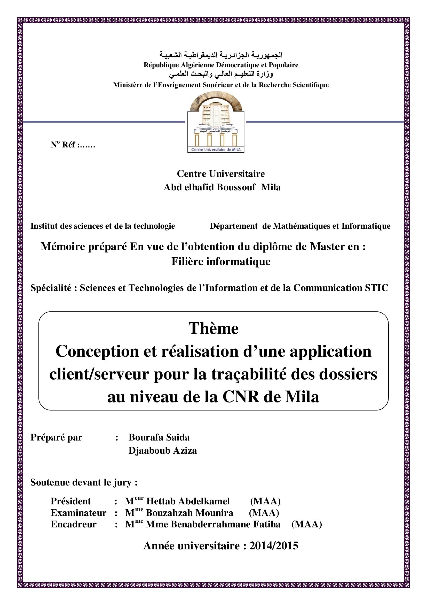 Bourafa Saida & Hettab Abdelkamel Président, B. (2015). Conception et réalisation d'une application client/ serveur pour la tracabilité des dossiers au niveau de la CNR de mia.